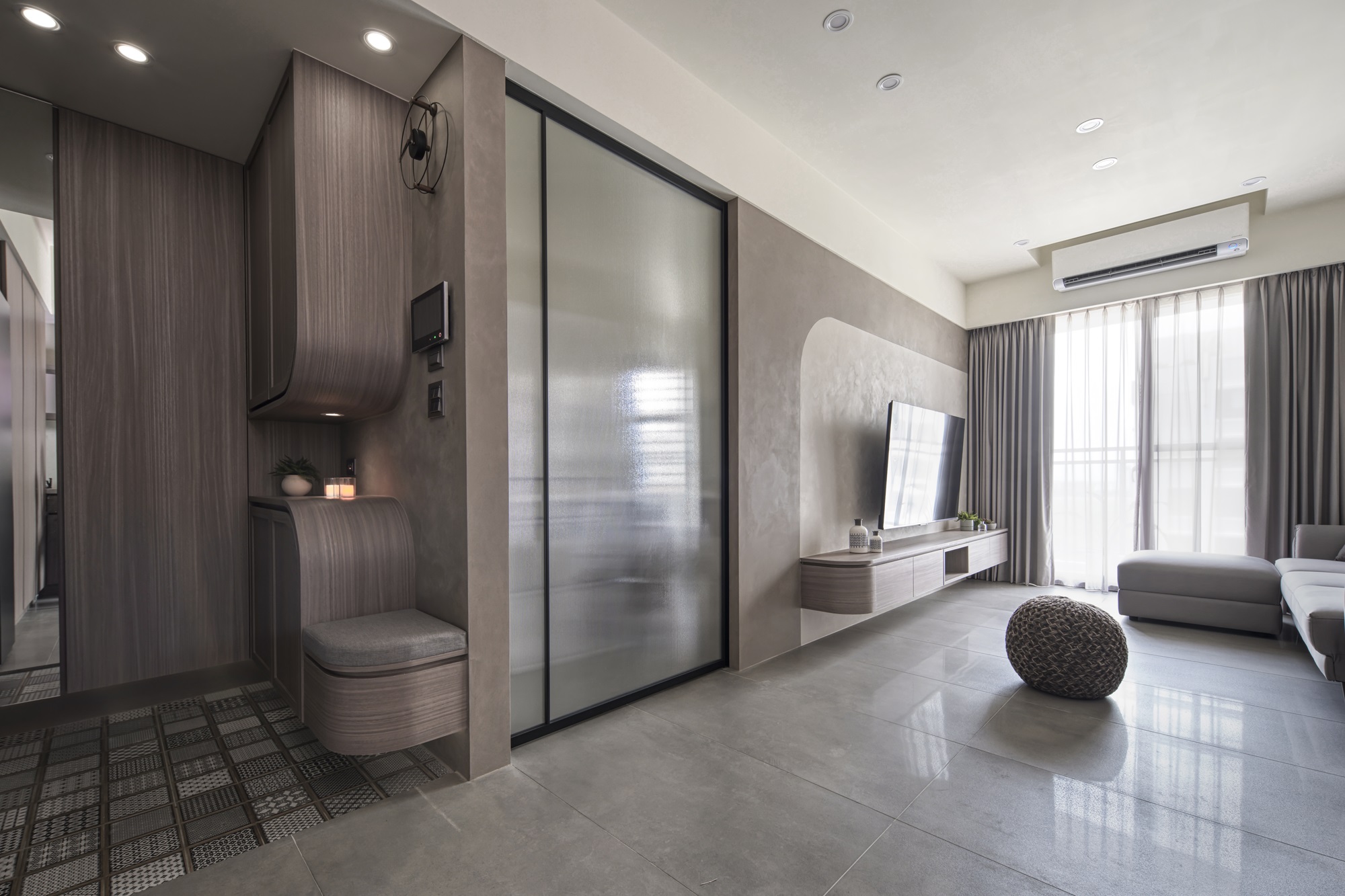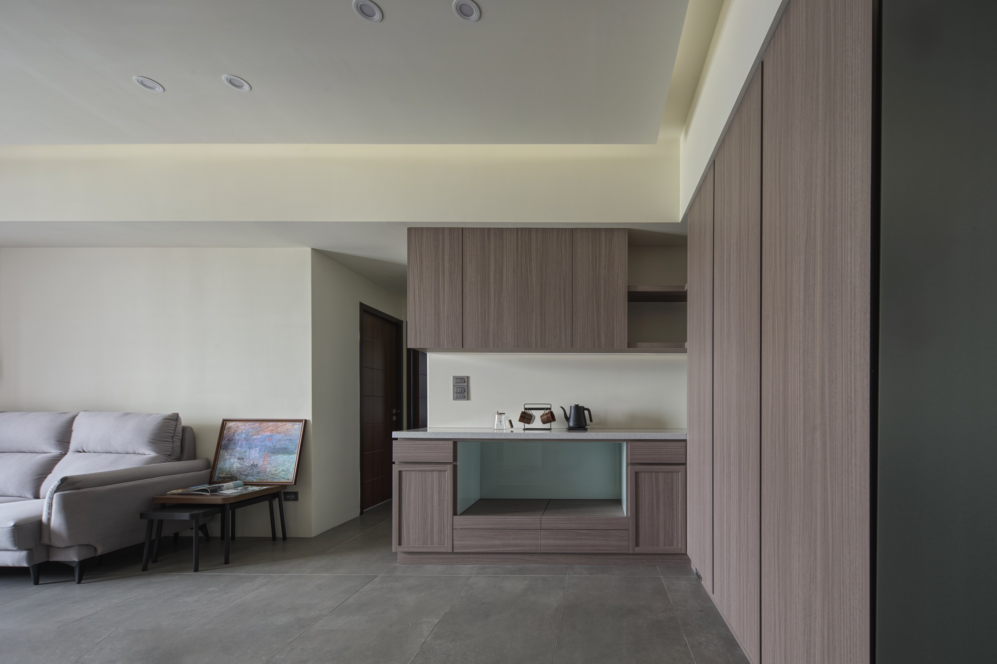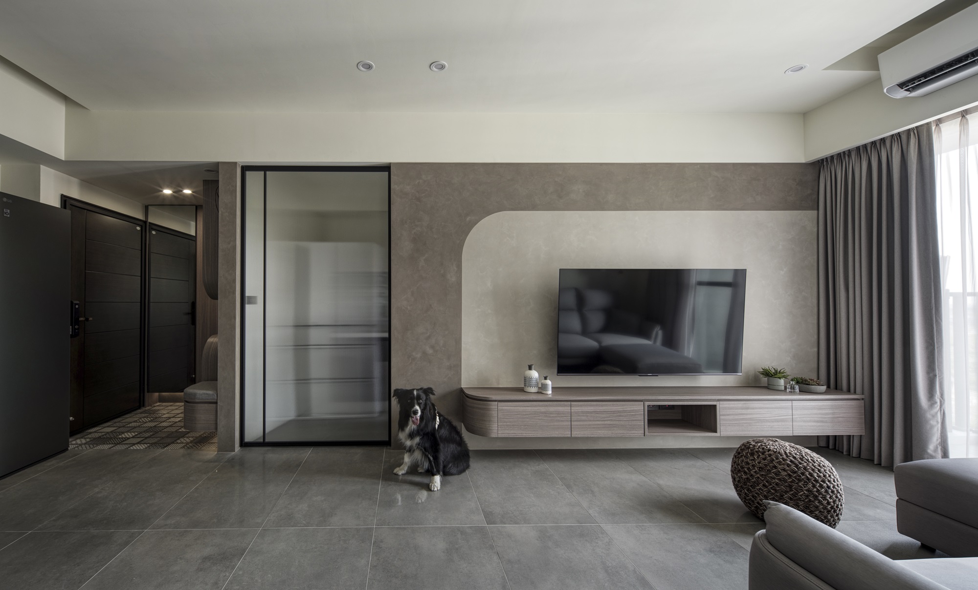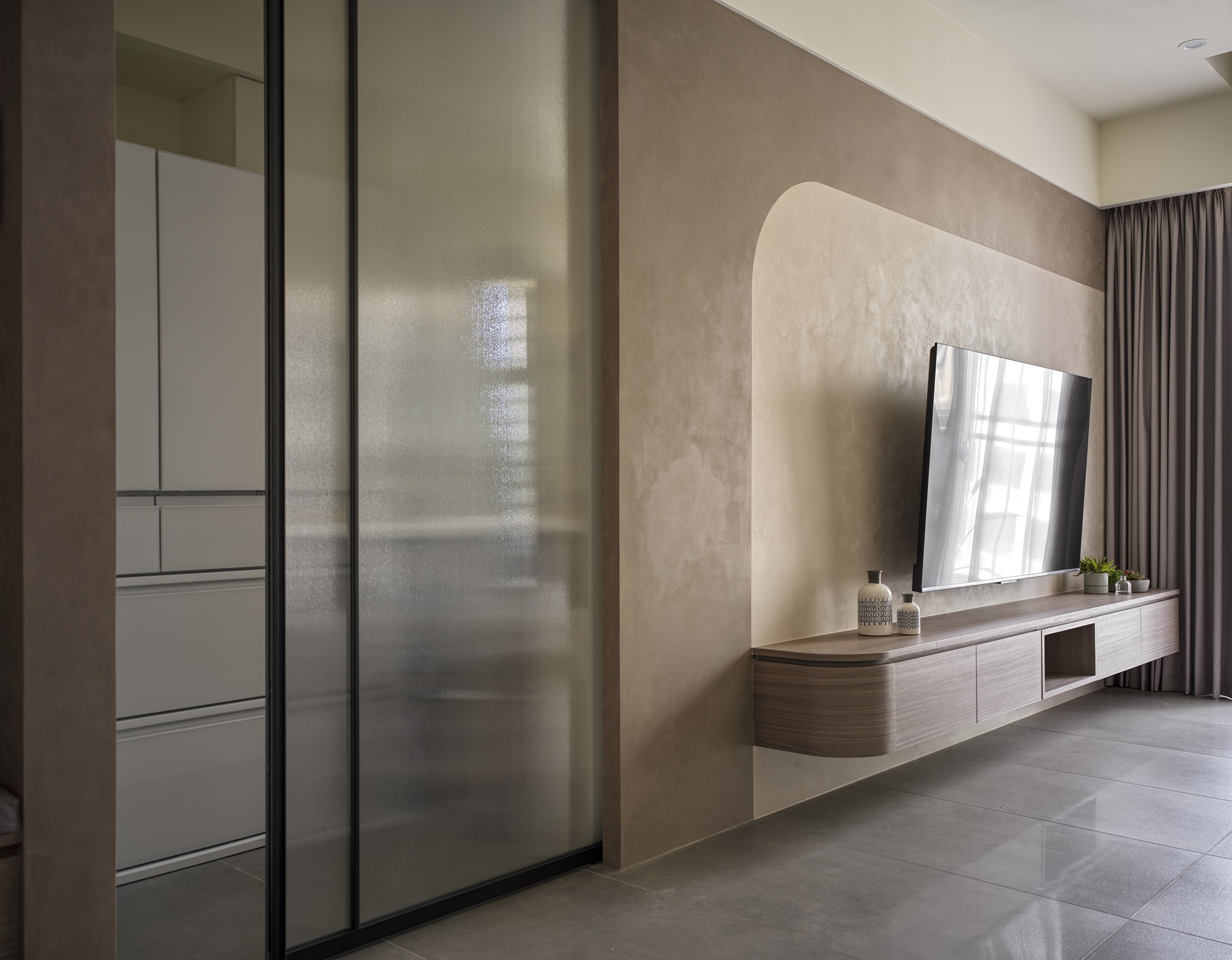 整體空間以 低飽和色調 為基底,沒有刻意裝飾,也不追求完美。灰階地坪搭配木紋與陶質漆面,將空間的「冷」轉化為「靜」。正如侘寂所揭示的:「不完美」與「時間痕跡」,才是空間最迷人的樣貌。 玻璃拉門輕柔分界,映照出屋內的寧靜秩序,黑框與深木相輝映,如水墨中一抹濃重。 這裡沒有多餘的言語,只有生活真實的留白與日常溫度的沈澱。