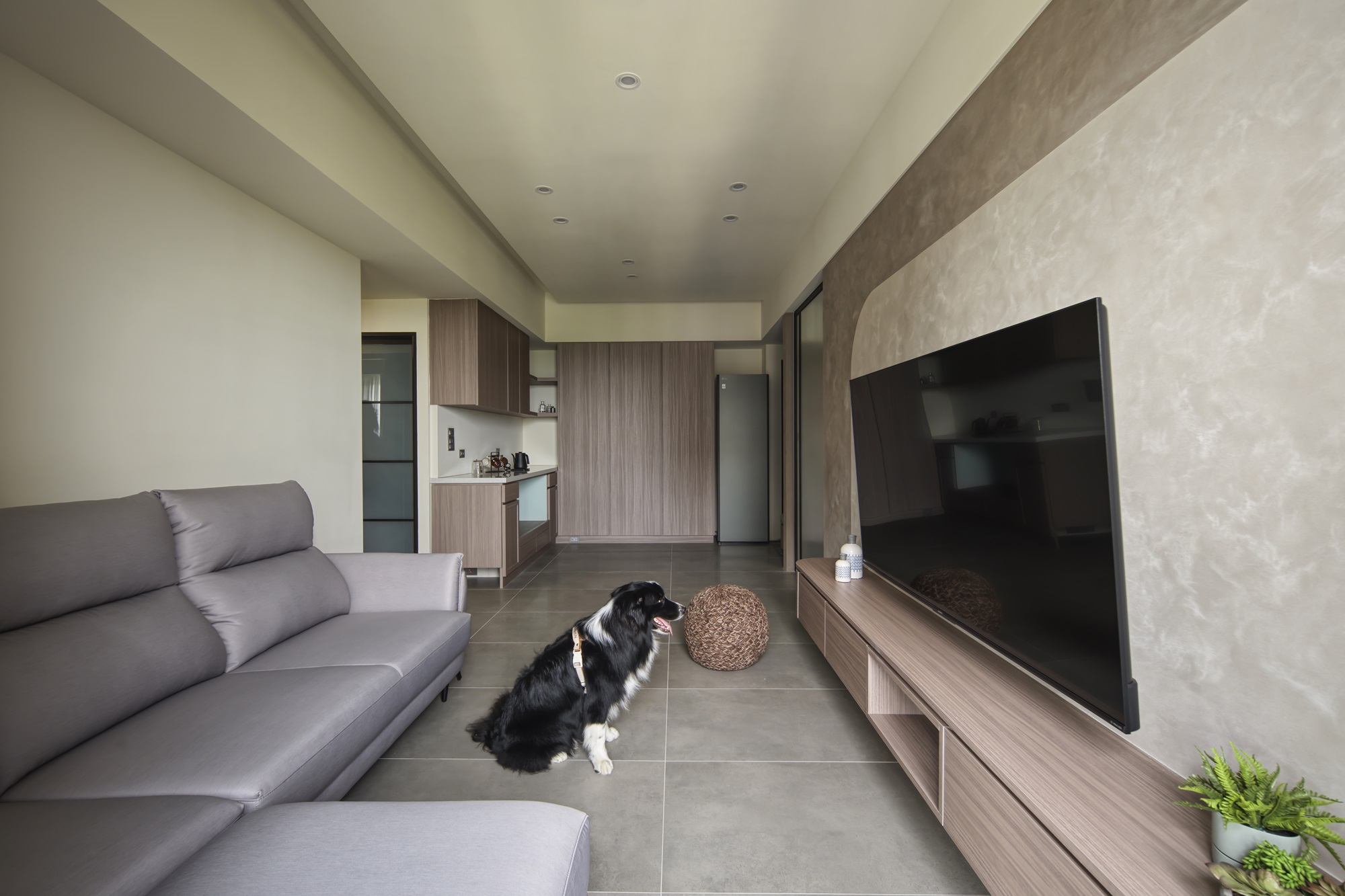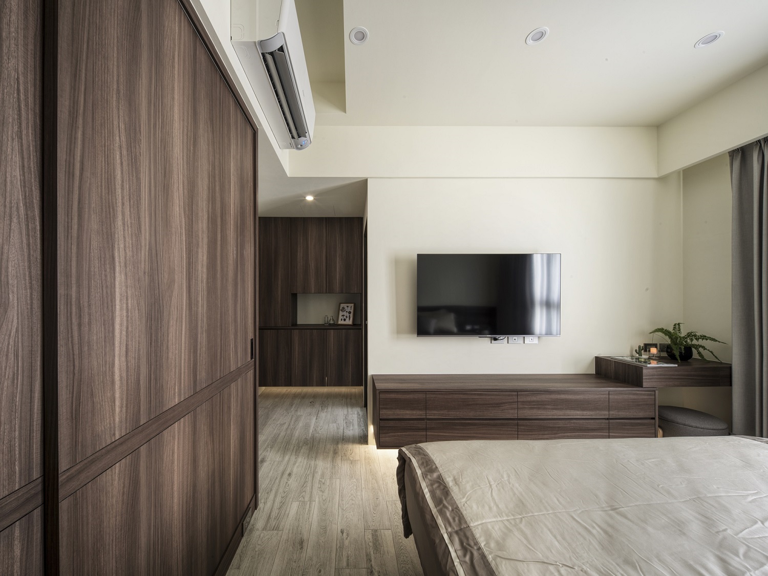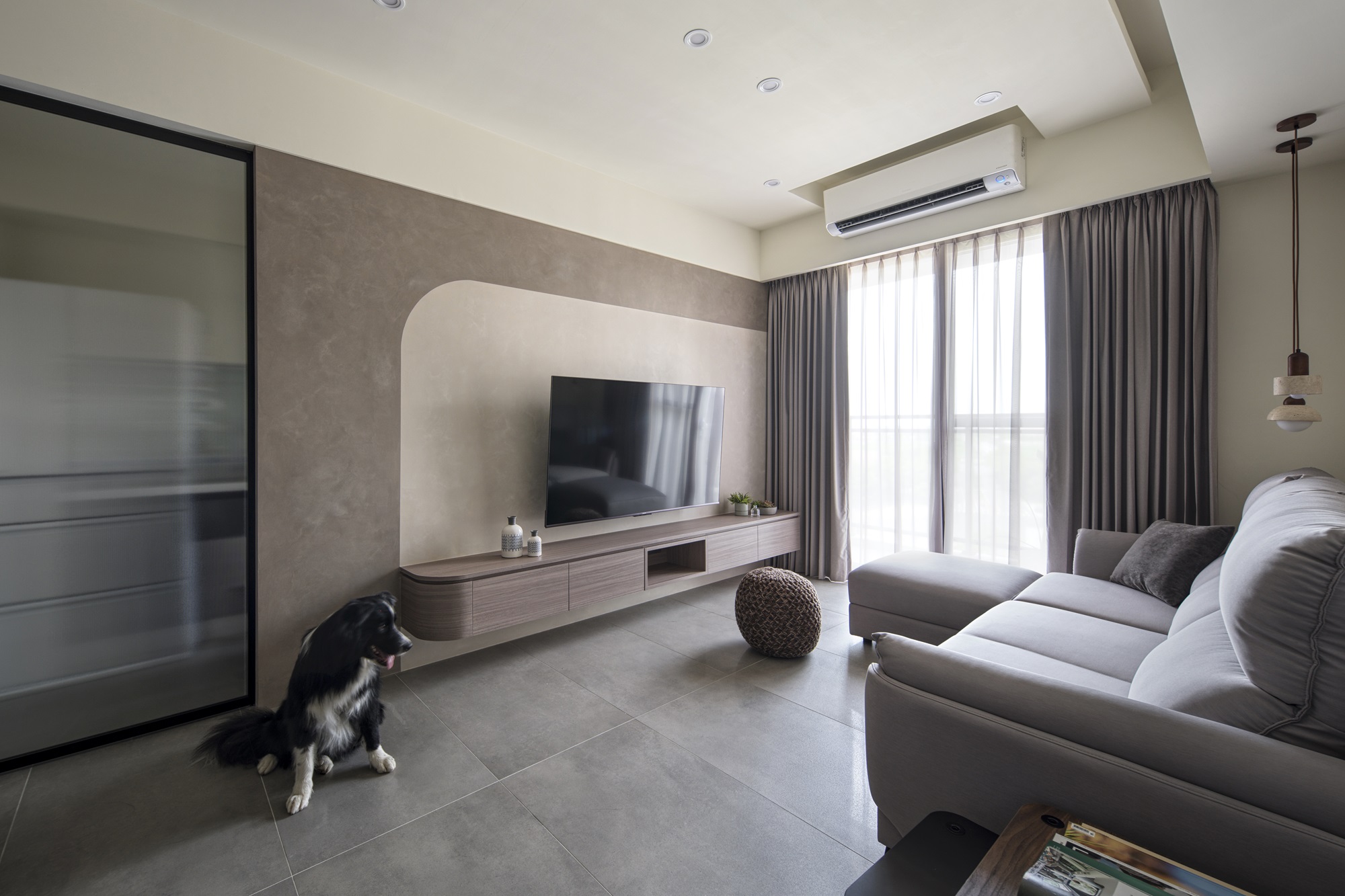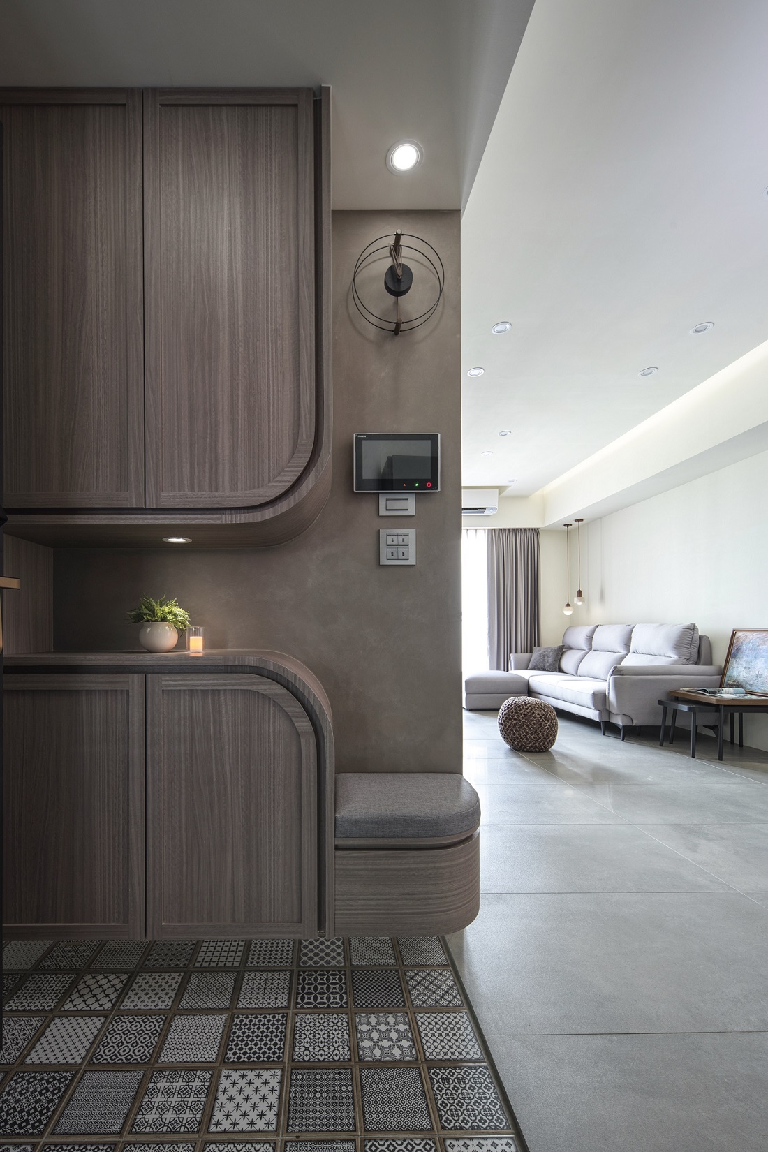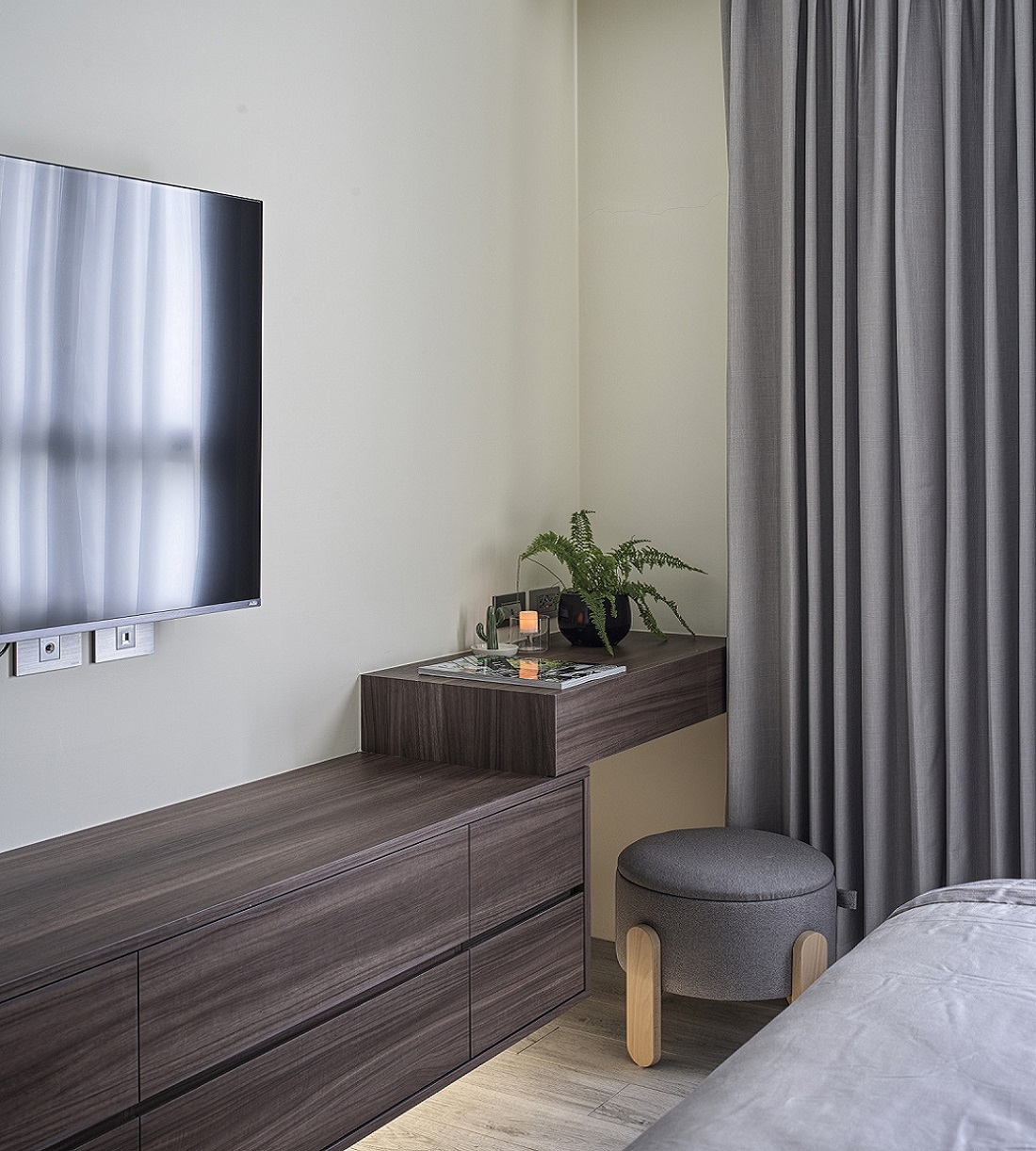 整體空間以 低飽和色調 為基底,沒有刻意裝飾,也不追求完美。灰階地坪搭配木紋與陶質漆面,將空間的「冷」轉化為「靜」。正如侘寂所揭示的:「不完美」與「時間痕跡」,才是空間最迷人的樣貌。 玻璃拉門輕柔分界,映照出屋內的寧靜秩序,黑框與深木相輝映,如水墨中一抹濃重。 這裡沒有多餘的言語,只有生活真實的留白與日常溫度的沈澱。
