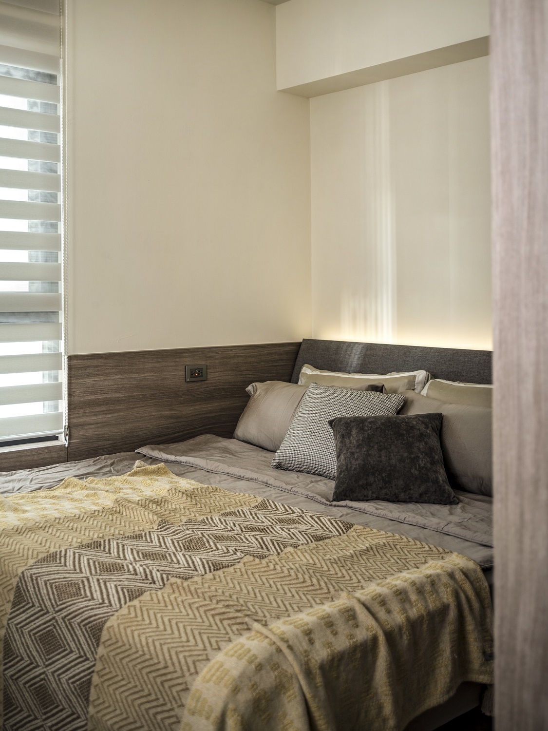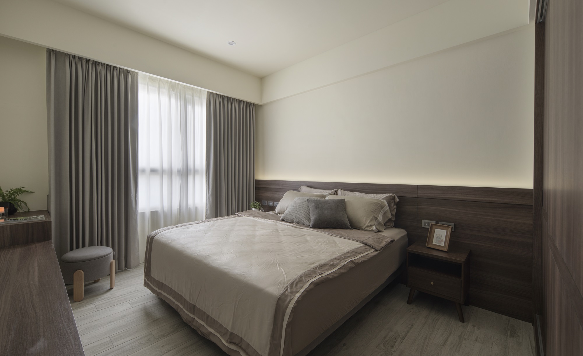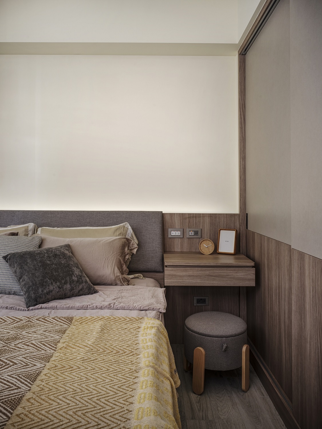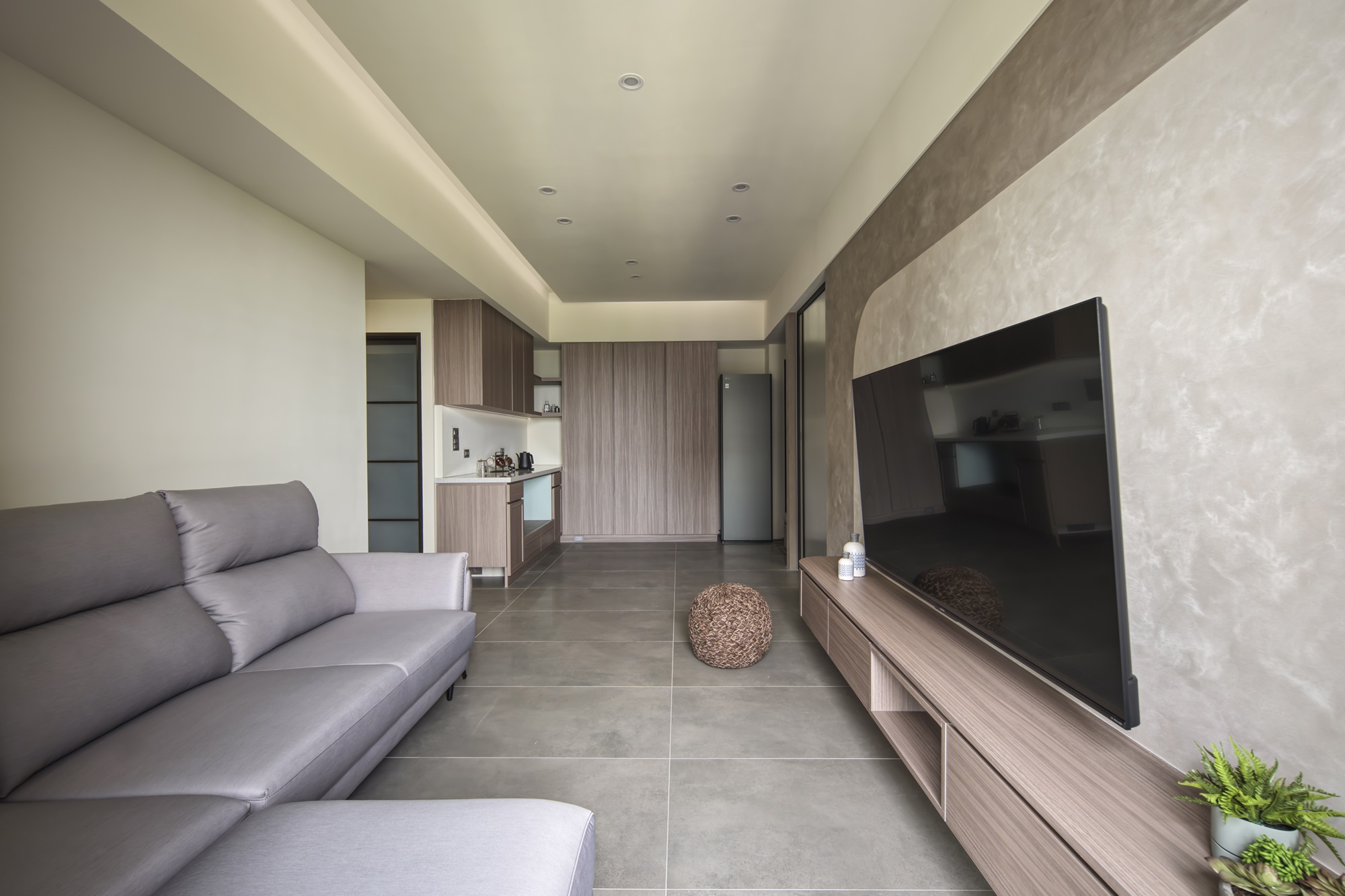 整體空間以 低飽和色調 為基底,沒有刻意裝飾,也不追求完美。灰階地坪搭配木紋與陶質漆面,將空間的「冷」轉化為「靜」。正如侘寂所揭示的:「不完美」與「時間痕跡」,才是空間最迷人的樣貌。 玻璃拉門輕柔分界,映照出屋內的寧靜秩序,黑框與深木相輝映,如水墨中一抹濃重。 這裡沒有多餘的言語,只有生活真實的留白與日常溫度的沈澱。