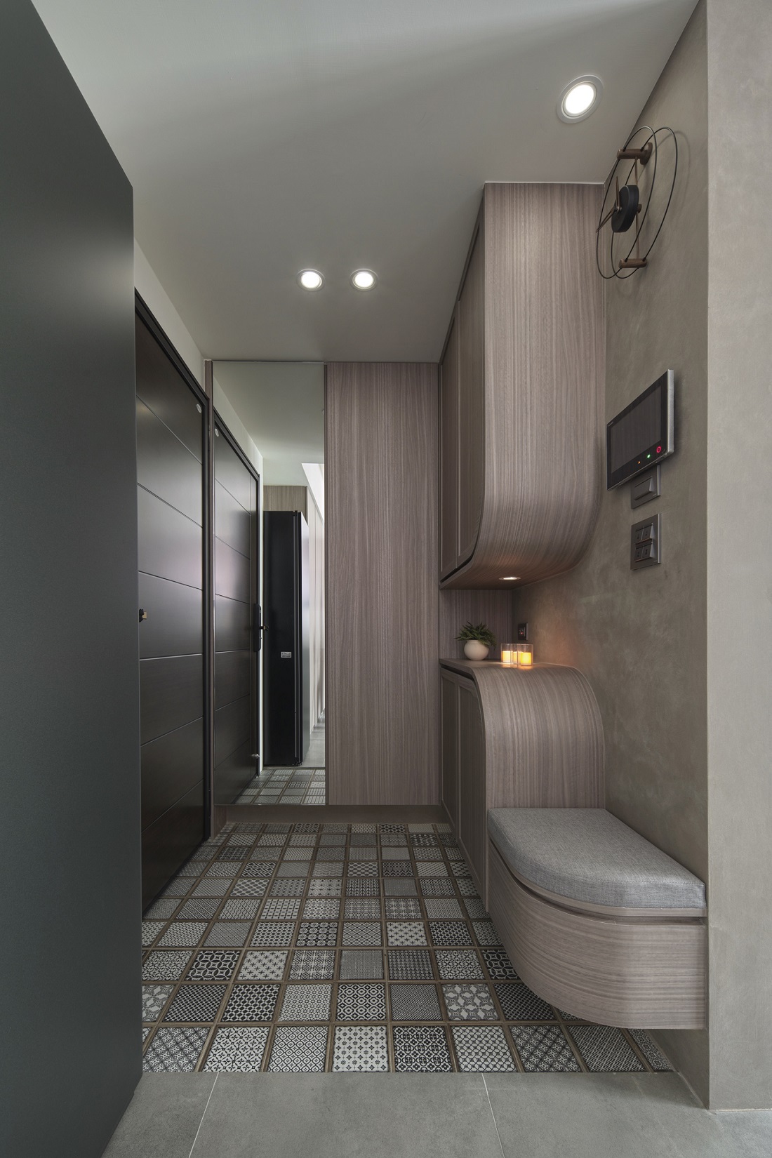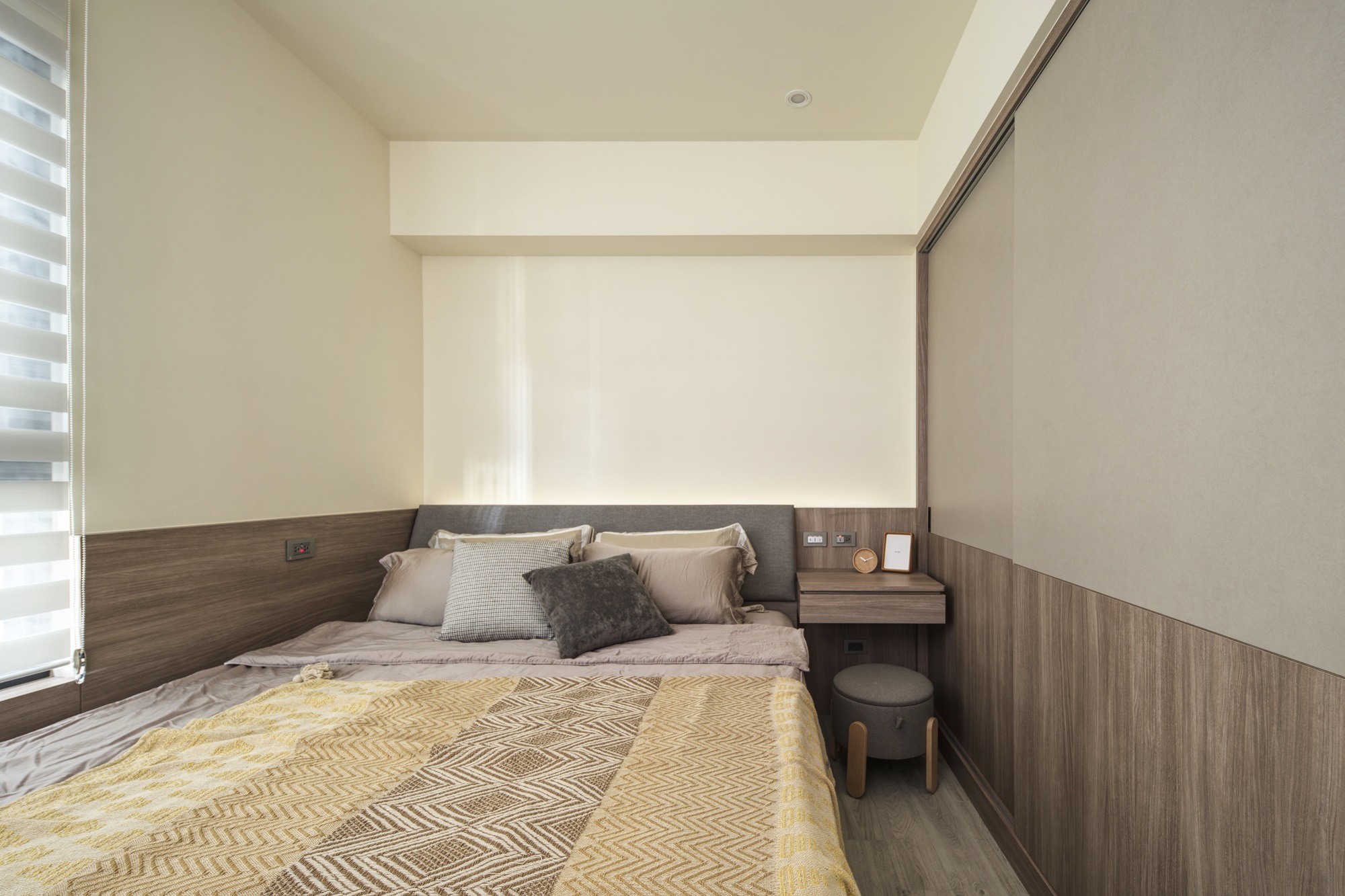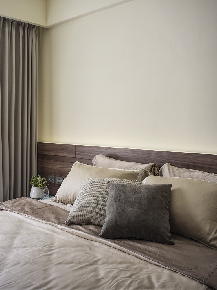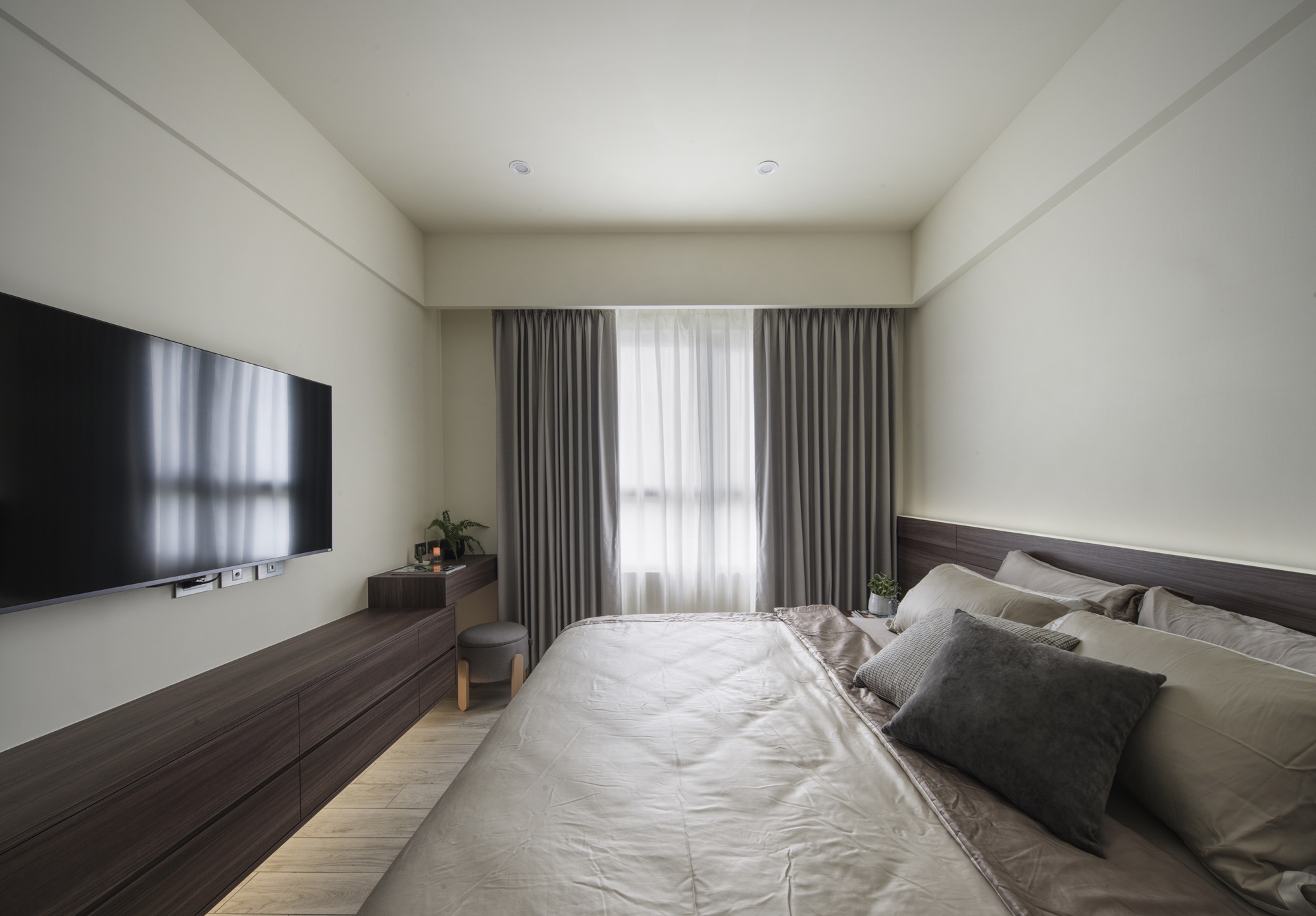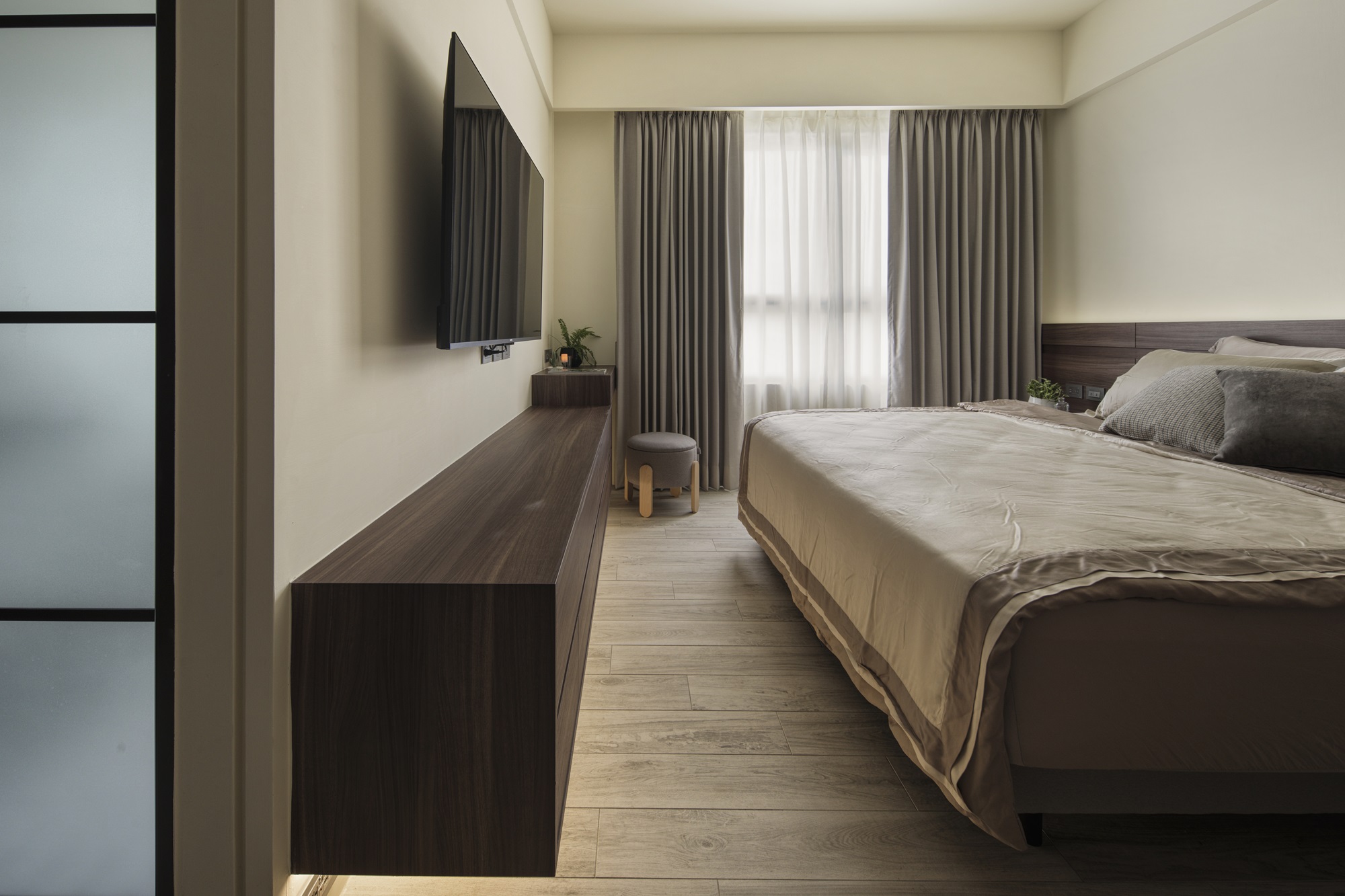 整體空間以 低飽和色調 為基底,沒有刻意裝飾,也不追求完美。灰階地坪搭配木紋與陶質漆面,將空間的「冷」轉化為「靜」。正如侘寂所揭示的:「不完美」與「時間痕跡」,才是空間最迷人的樣貌。 玻璃拉門輕柔分界,映照出屋內的寧靜秩序,黑框與深木相輝映,如水墨中一抹濃重。 這裡沒有多餘的言語,只有生活真實的留白與日常溫度的沈澱。