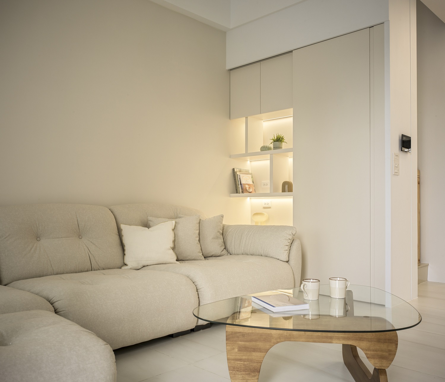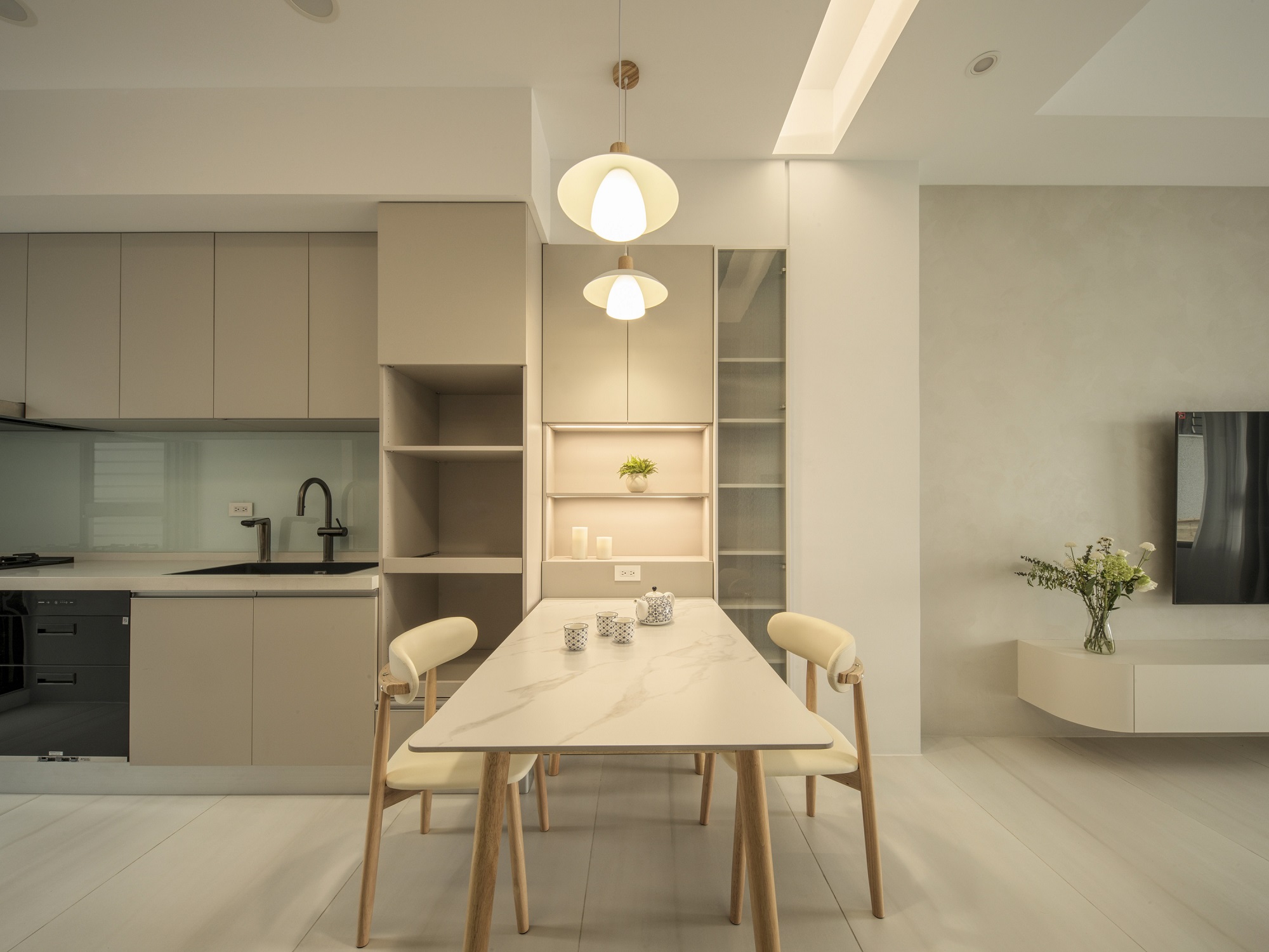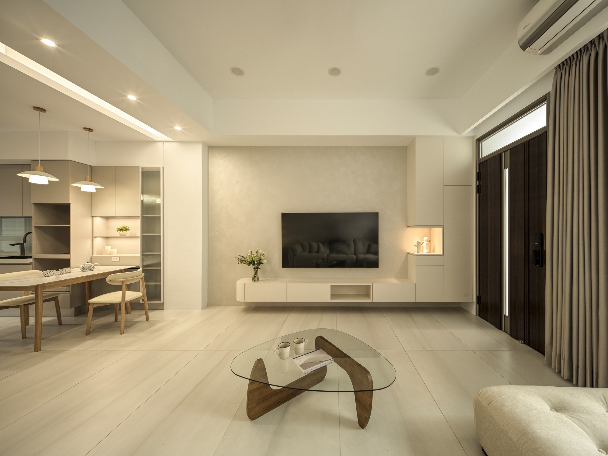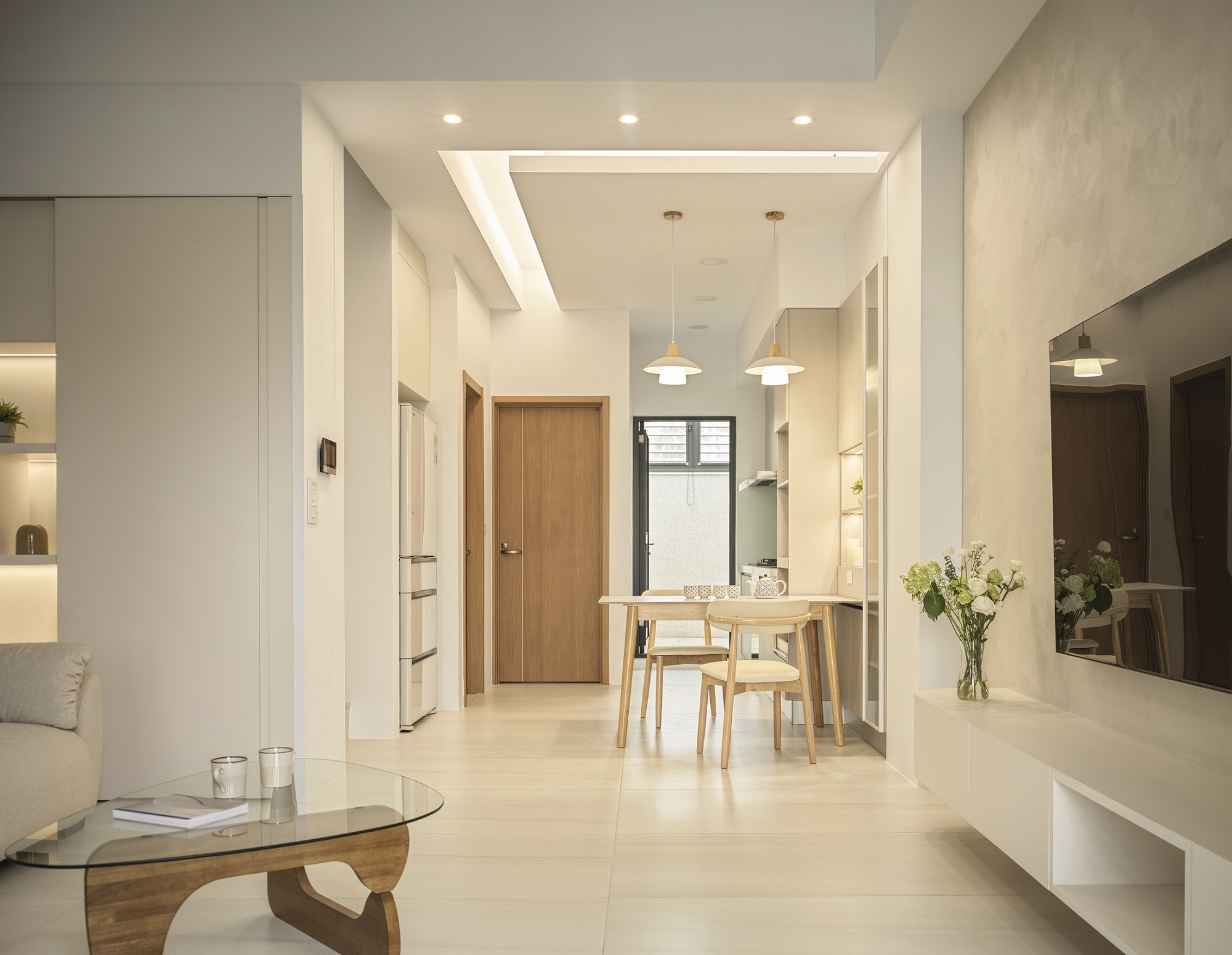 白色輕輕鋪展每一面牆,像陽光落下後,靜靜停留的溫度。一樓的地坪以拋光石英磚映照著日常光影,空氣流動於客廳、餐廳與廚房之間,自然地串起三餐與四季的故事。 客廳裡,一張米白色的大沙發沉穩地佔據視線中央,成為兩人下班後最柔軟的歸屬。他們可以靜靜地並肩坐著,不語也不急,只讓彼此的存在成為一種陪伴。 二樓的木地板溫潤腳底,主臥與更衣室在暖白中靜靜展開,細節藏在不語的和諧裡。 這個家,沒有強烈的張揚,卻處處是細膩。放慢腳步,我們終於懂了:生活,不該追趕,而是慢慢感受。在這樣的空間裡,時間變得柔軟,人與人之間的距離,也變得剛剛好。