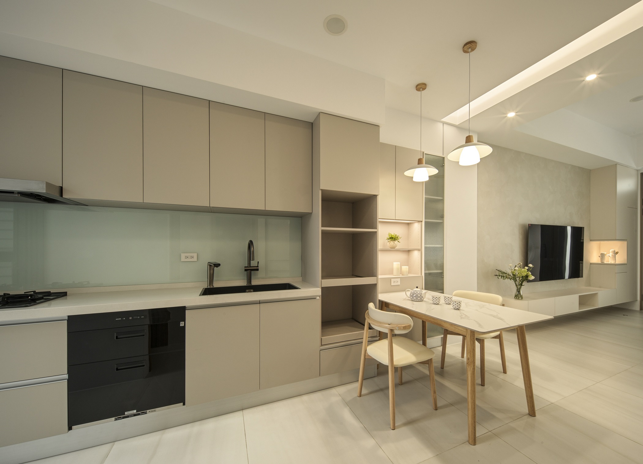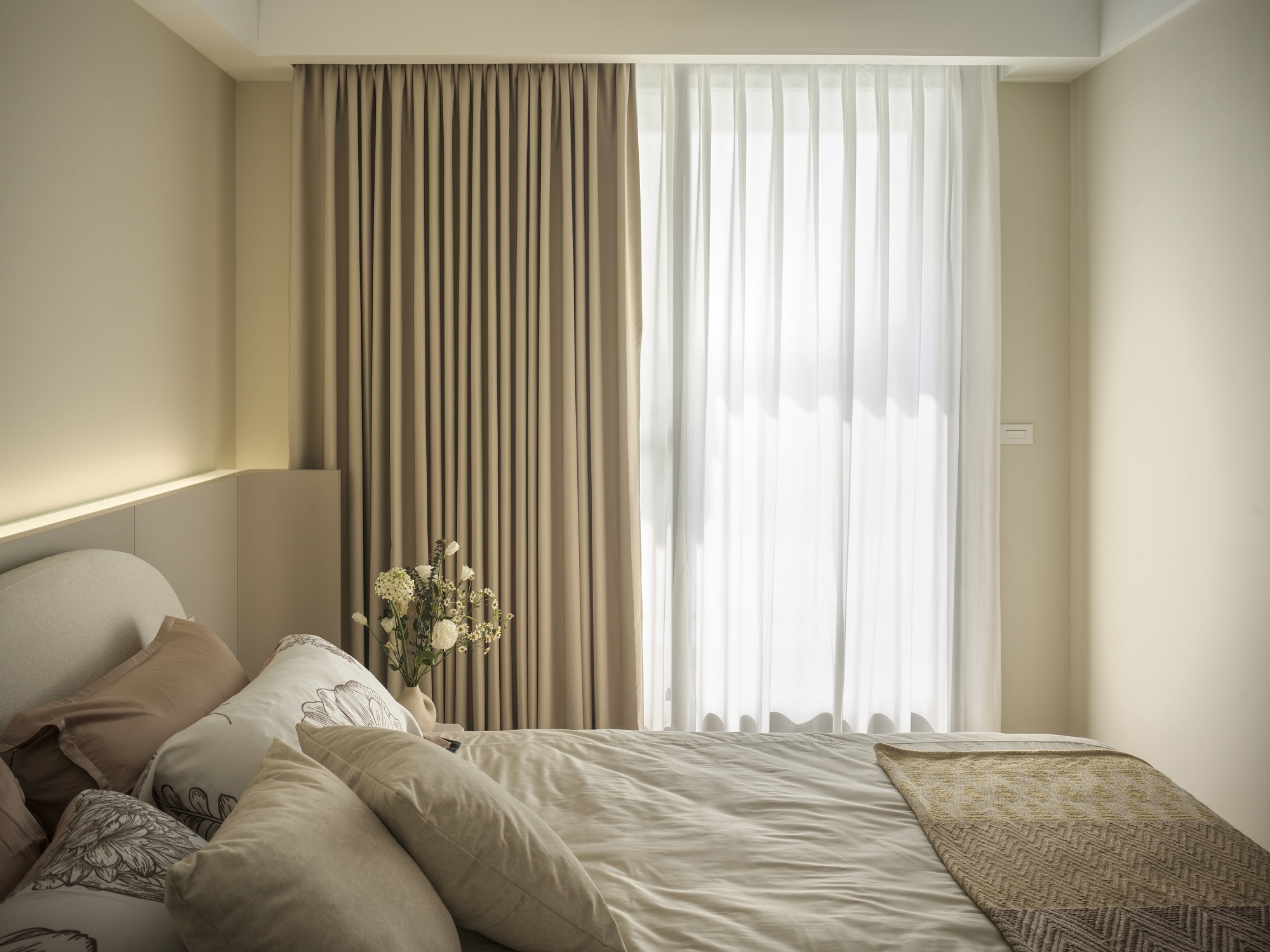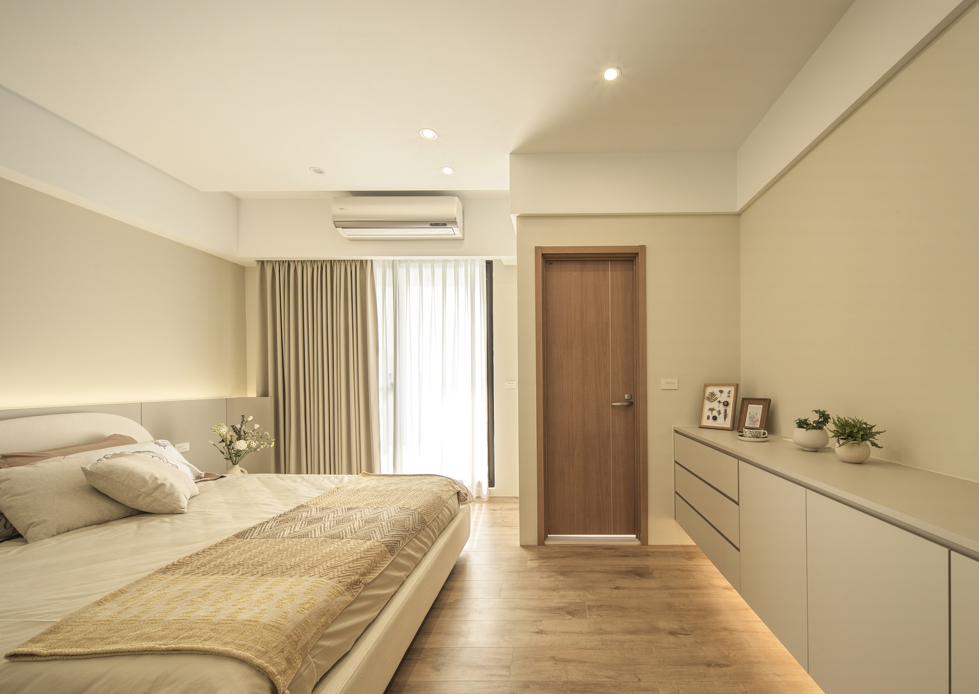 白色輕輕鋪展每一面牆,像陽光落下後,靜靜停留的溫度。一樓的地坪以拋光石英磚映照著日常光影,空氣流動於客廳、餐廳與廚房之間,自然地串起三餐與四季的故事。 客廳裡,一張米白色的大沙發沉穩地佔據視線中央,成為兩人下班後最柔軟的歸屬。他們可以靜靜地並肩坐著,不語也不急,只讓彼此的存在成為一種陪伴。 二樓的木地板溫潤腳底,主臥與更衣室在暖白中靜靜展開,細節藏在不語的和諧裡。 這個家,沒有強烈的張揚,卻處處是細膩。放慢腳步,我們終於懂了:生活,不該追趕,而是慢慢感受。在這樣的空間裡,時間變得柔軟,人與人之間的距離,也變得剛剛好。