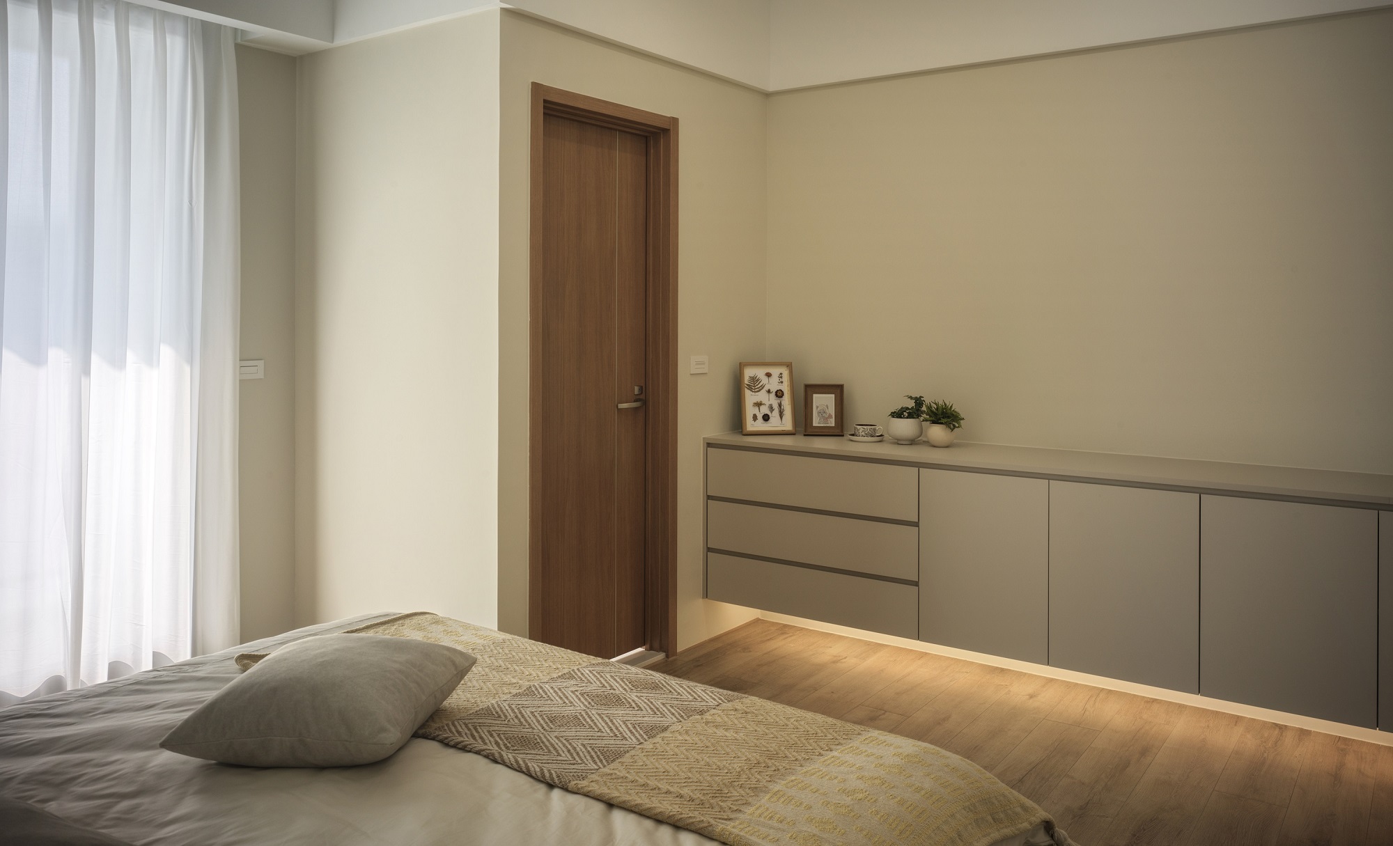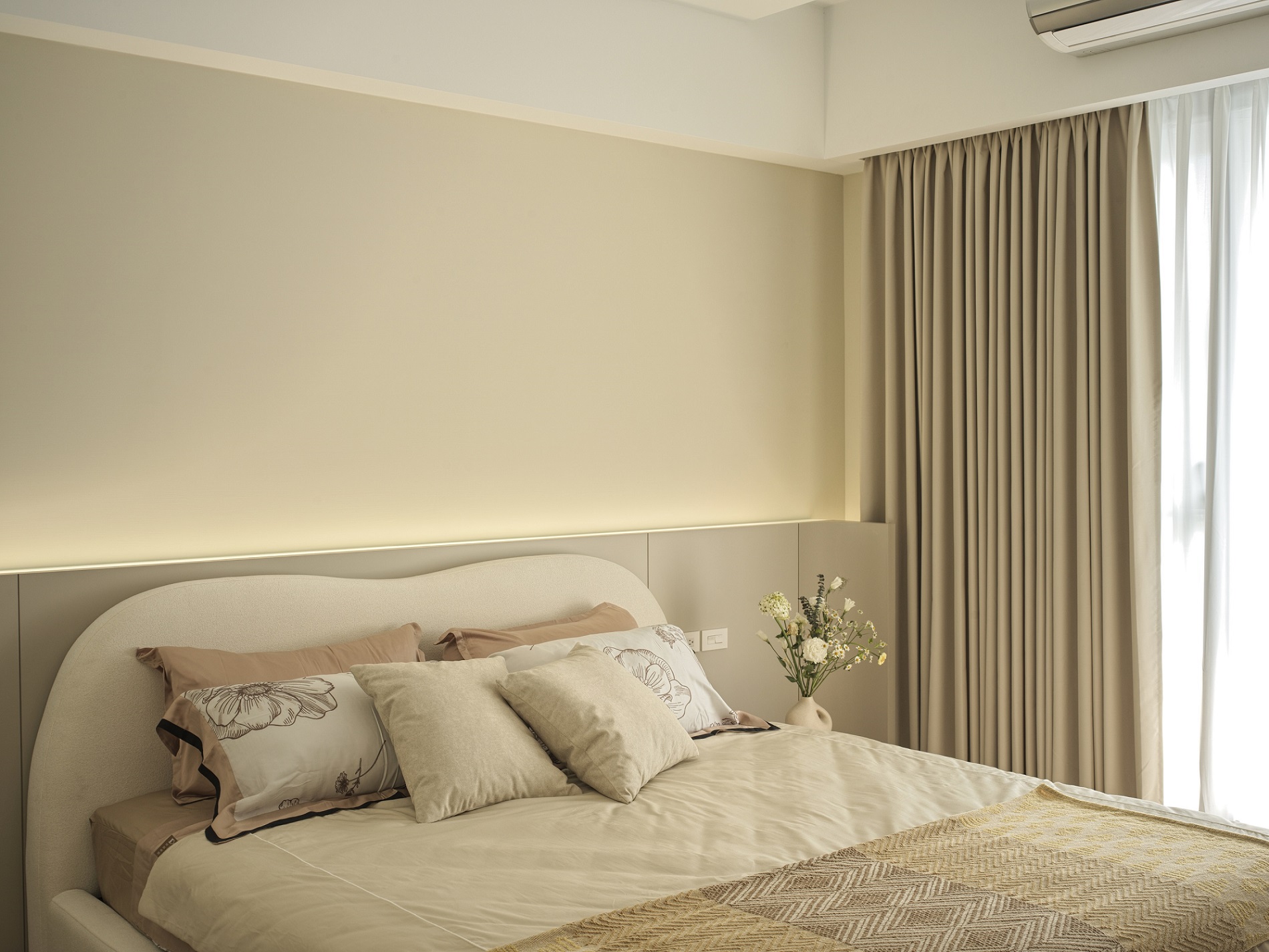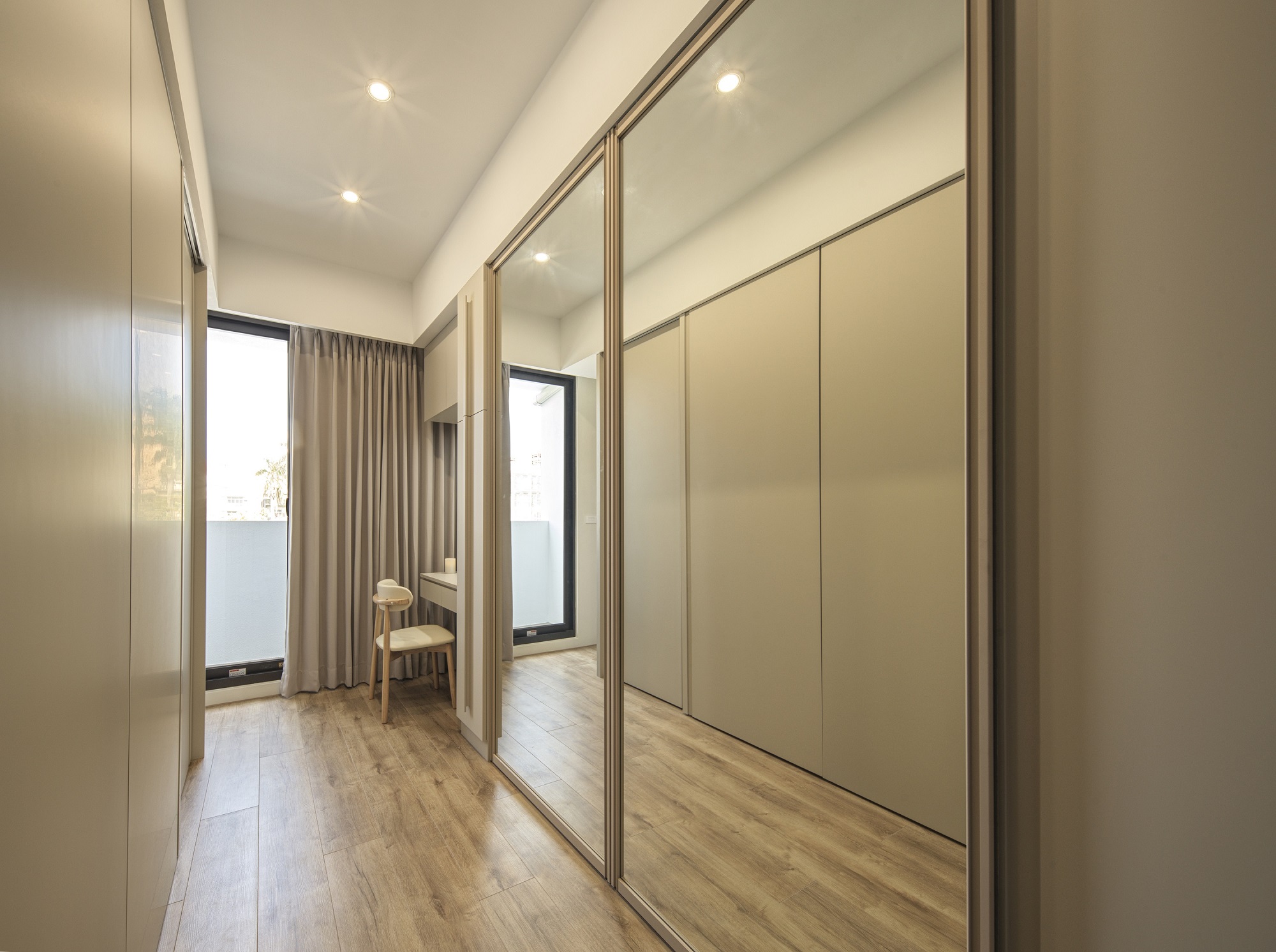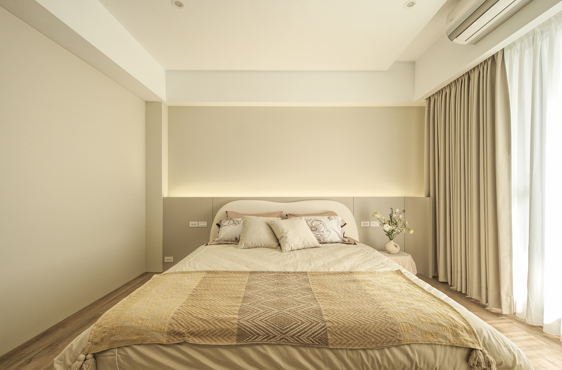 白色輕輕鋪展每一面牆,像陽光落下後,靜靜停留的溫度。一樓的地坪以拋光石英磚映照著日常光影,空氣流動於客廳、餐廳與廚房之間,自然地串起三餐與四季的故事。 客廳裡,一張米白色的大沙發沉穩地佔據視線中央,成為兩人下班後最柔軟的歸屬。他們可以靜靜地並肩坐著,不語也不急,只讓彼此的存在成為一種陪伴。 二樓的木地板溫潤腳底,主臥與更衣室在暖白中靜靜展開,細節藏在不語的和諧裡。 這個家,沒有強烈的張揚,卻處處是細膩。放慢腳步,我們終於懂了:生活,不該追趕,而是慢慢感受。在這樣的空間裡,時間變得柔軟,人與人之間的距離,也變得剛剛好。