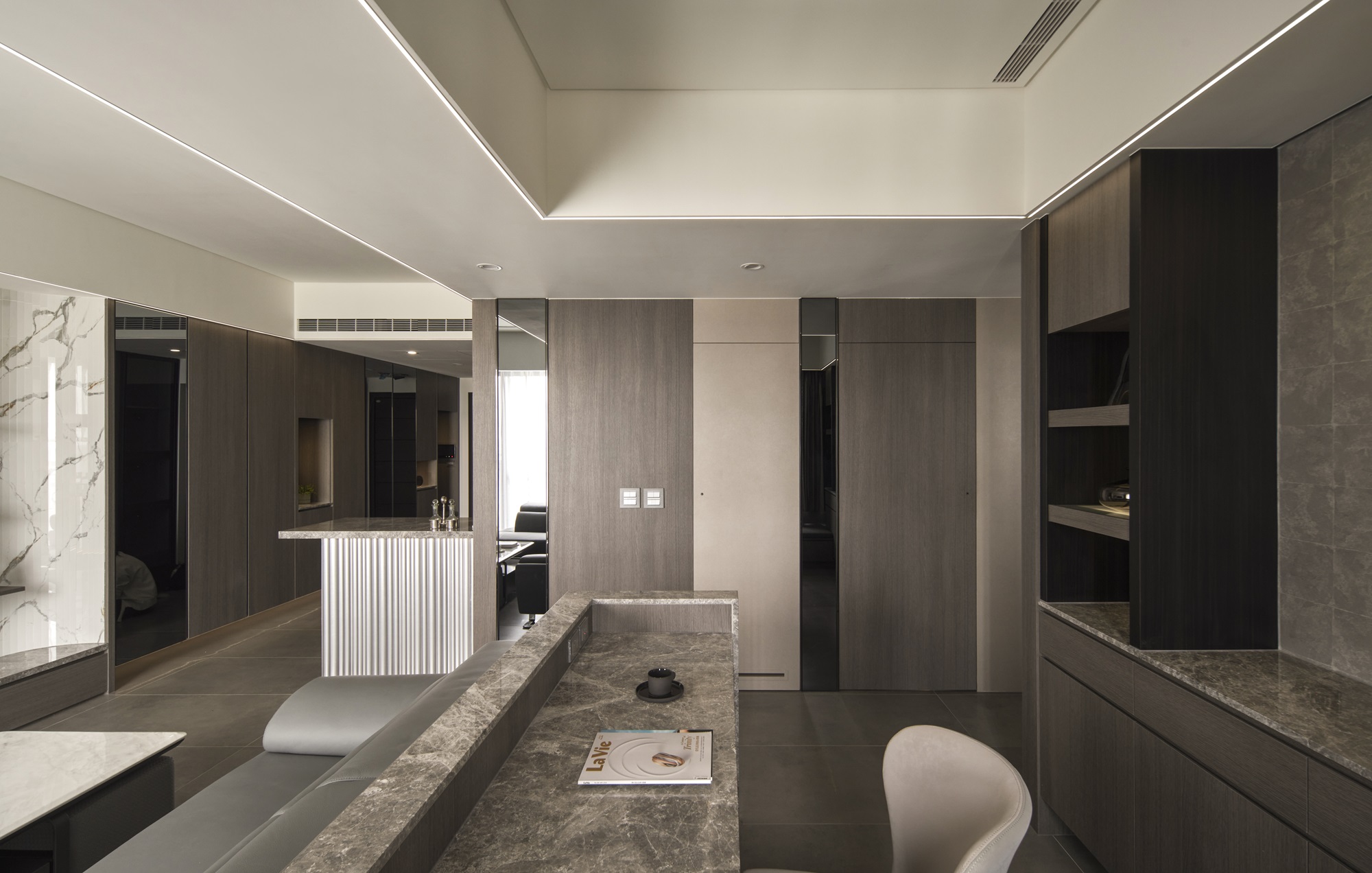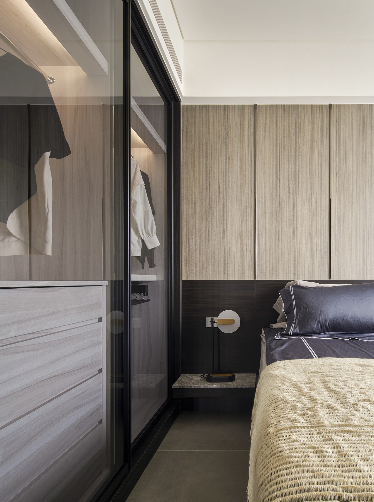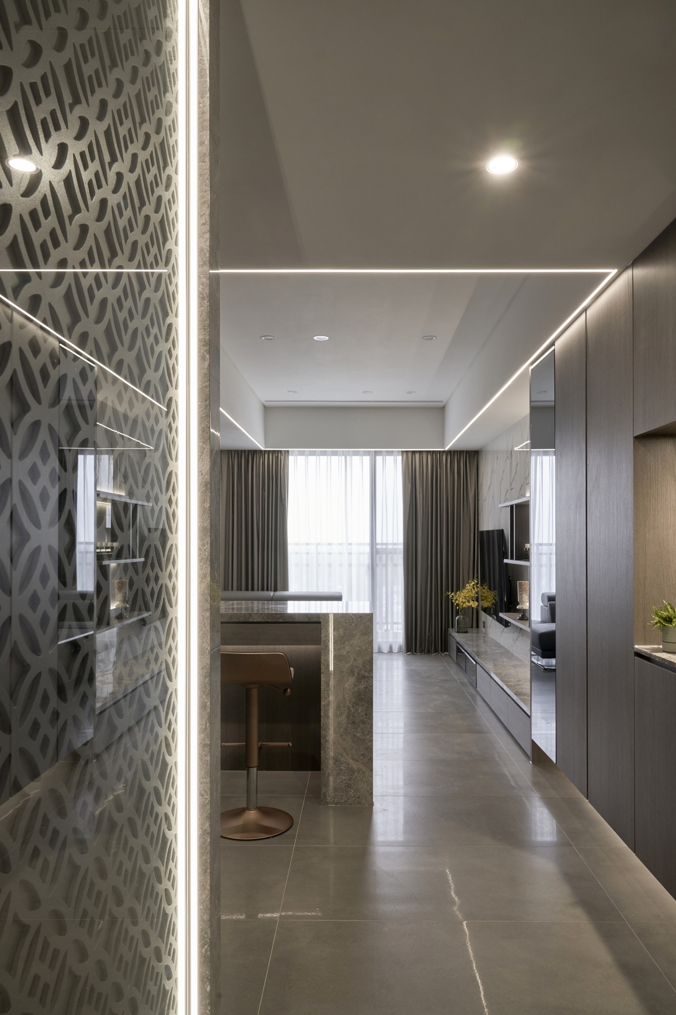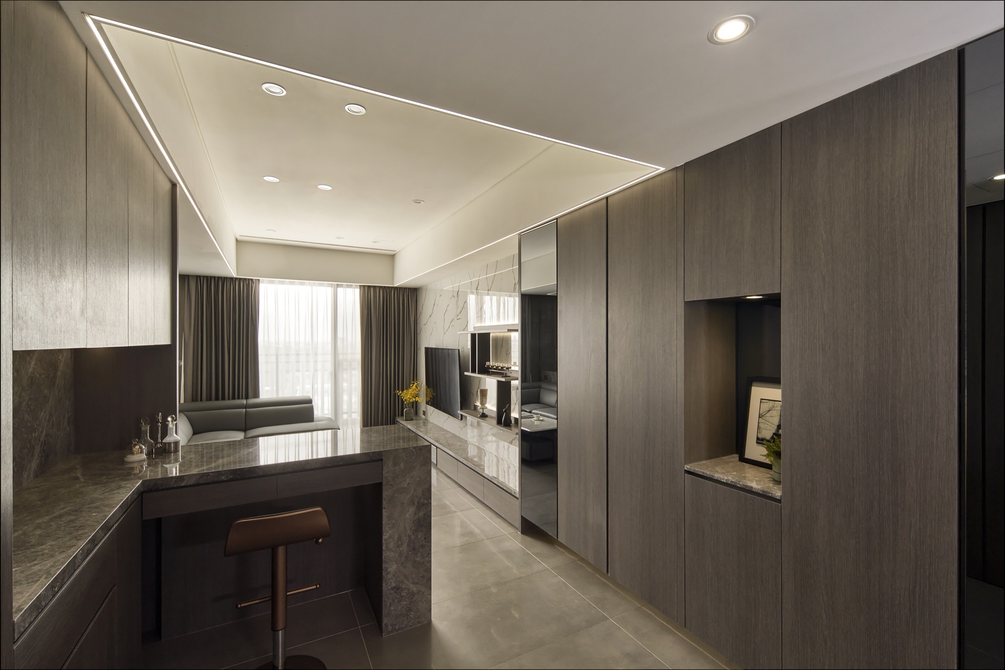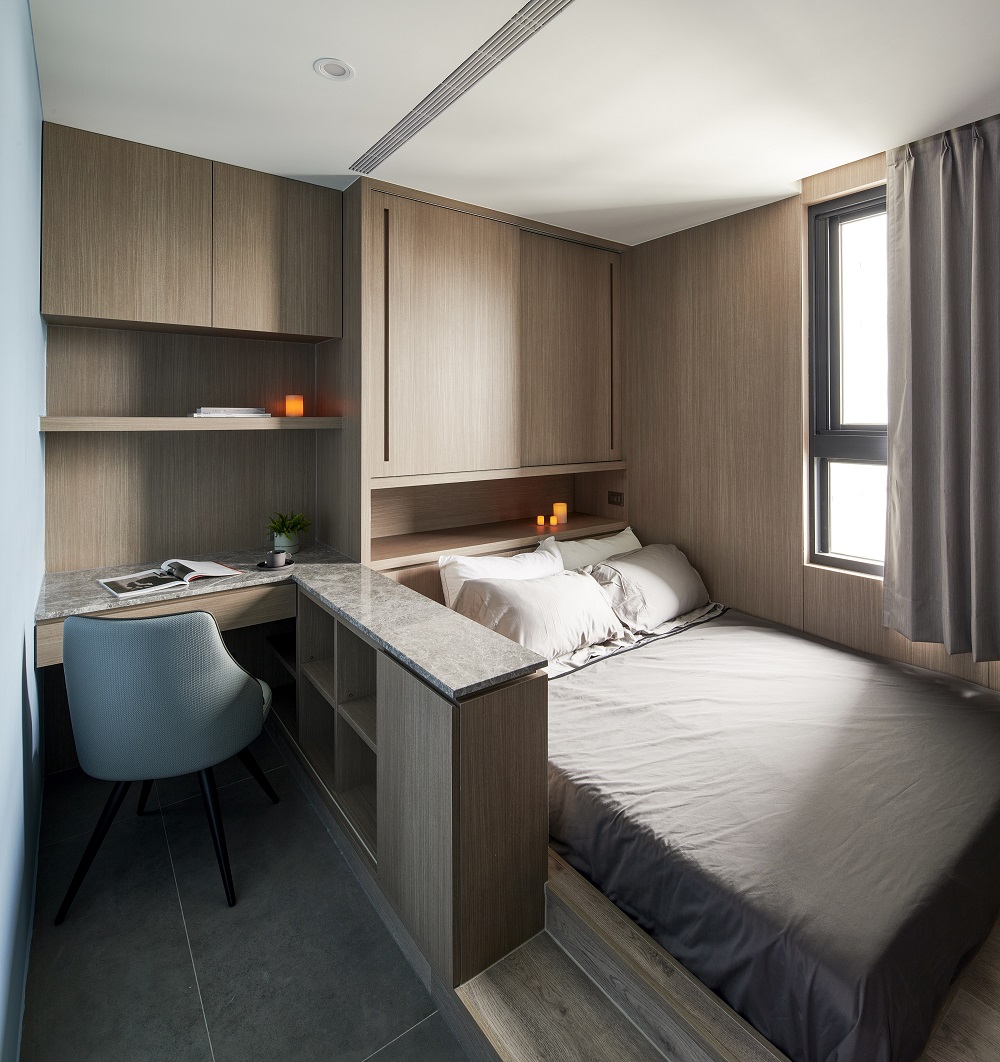 川流不息的紛擾,在我關上門的那一刻得以喘息。 現代生活充滿了表象,而我所嚮往的,是一段能與自己對話的靜謐時光。 當我與知心好友對坐吧檯,空氣中瀰漫著咖啡的香氣,苦甜之間是生活的滋味。閱讀區坐落空間中央,如同精神的核心,承載思索與感知,也容納我在日常中逐漸清晰的自我。 走道巧妙地隱藏浴室與臥房的門片,盡頭以天然石材與烤漆玻璃勾勒出一道曲面端景牆,柔化了動線的結束,也暗藏對空間語言的延伸。 主臥以輕盈為主調,衣櫃選用黑玻與鋁框滑門,主浴門與電視牆共構成一體牆面,視覺乾淨一致。 此案為客變屋, 在一開始就強調無障礙需求, 所以在浴室與外面地板銜接時只有微落差,頭腦尚未清醒去使用浴廁不會用絆倒的風險。 次臥床位略升,床頭與床尾巧設衣櫃,特別是在床位以下的衣櫃內部仍可置物,平衡全室的收納量;L型書桌劃分睡眠與學習,也拓展了使用檯面的自由度。