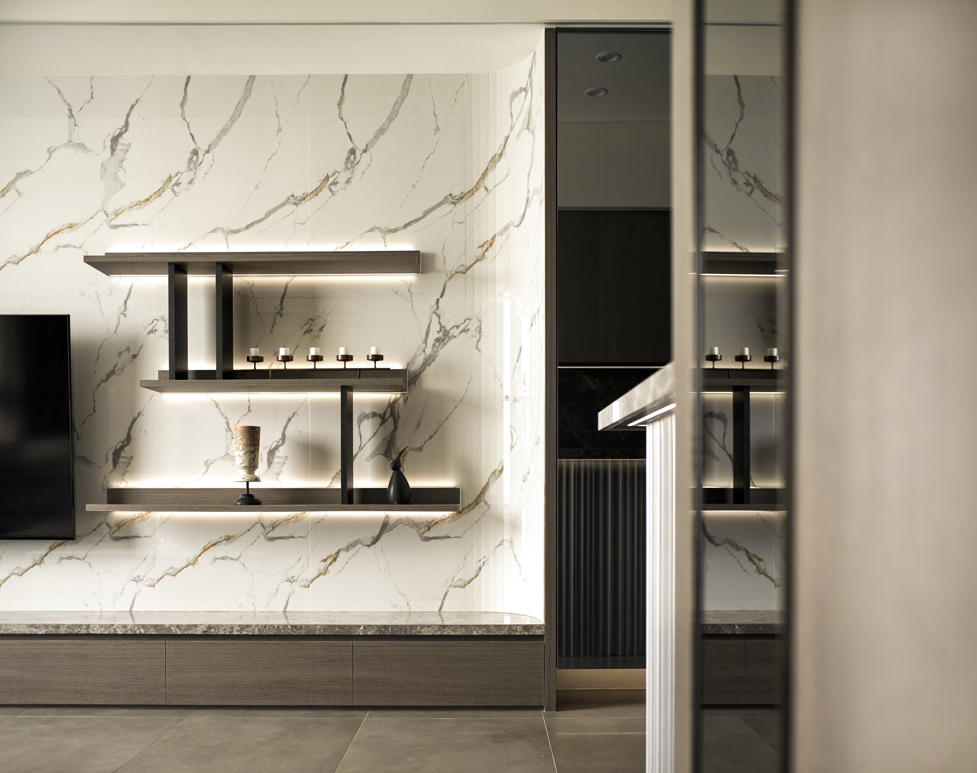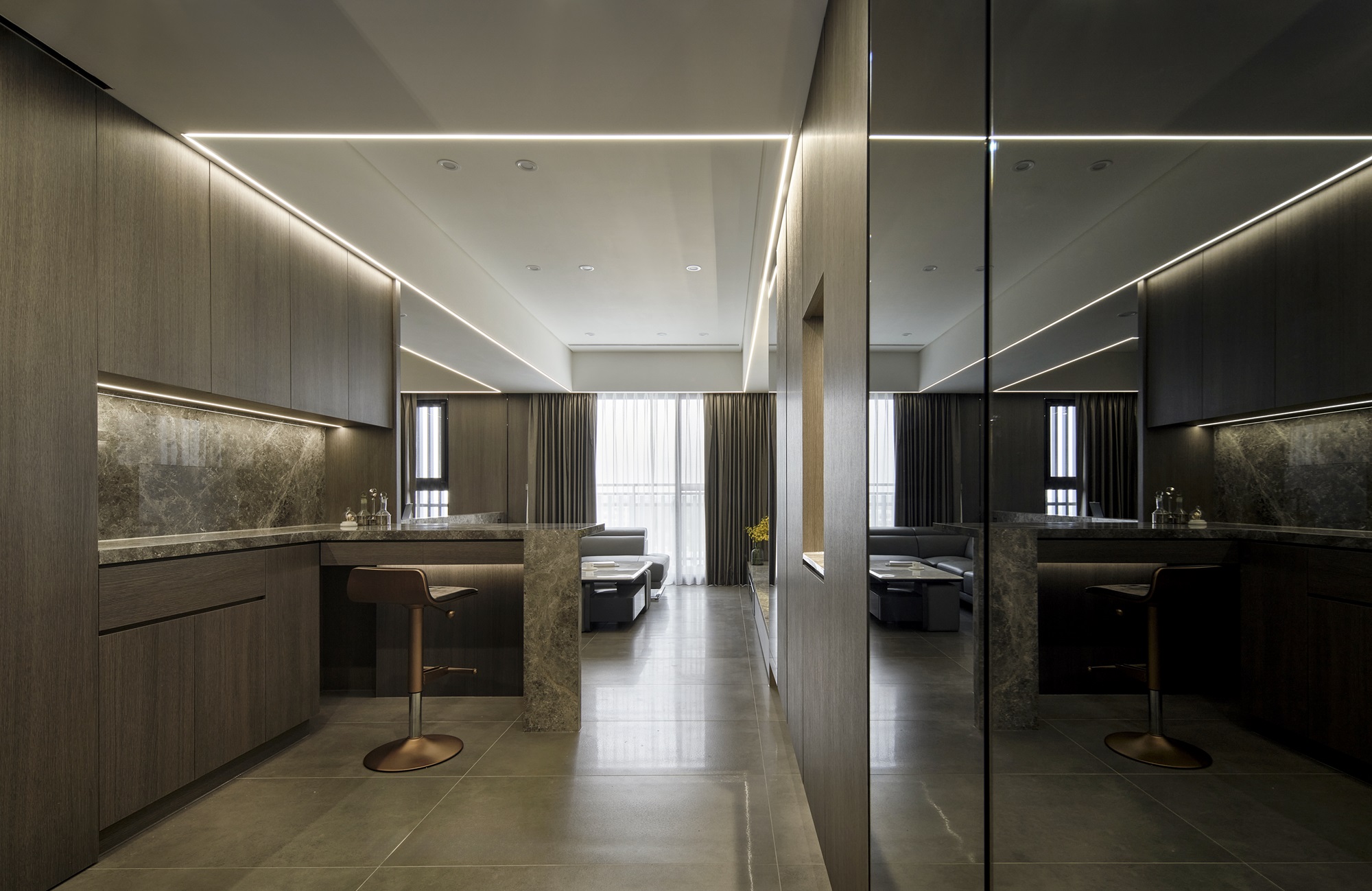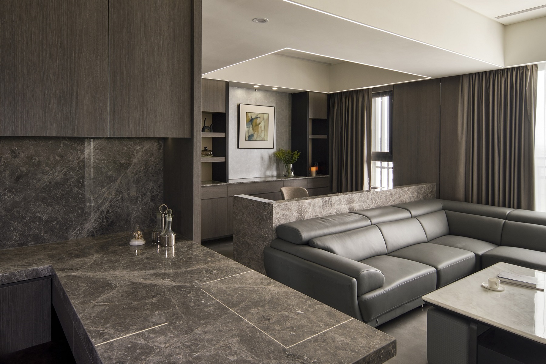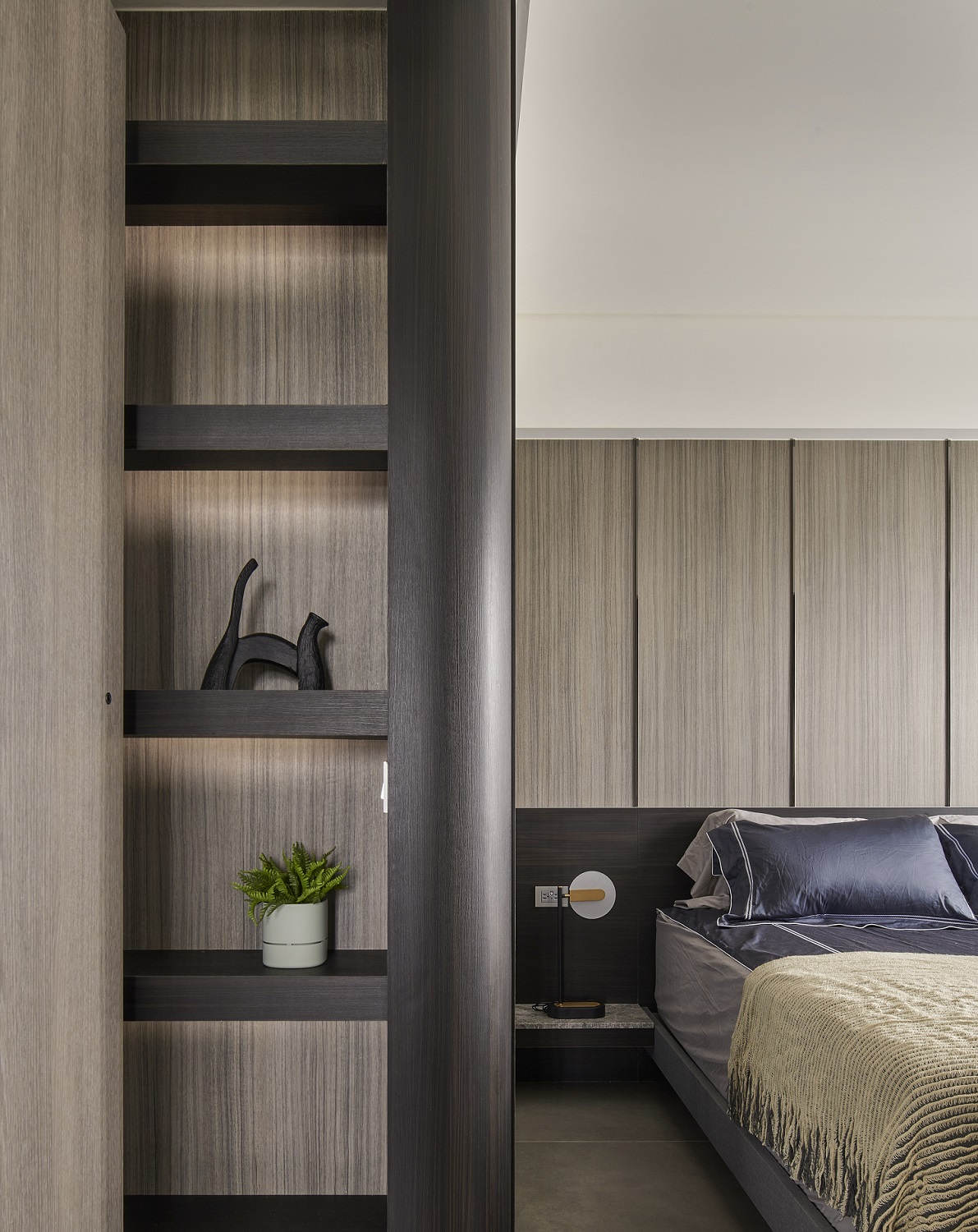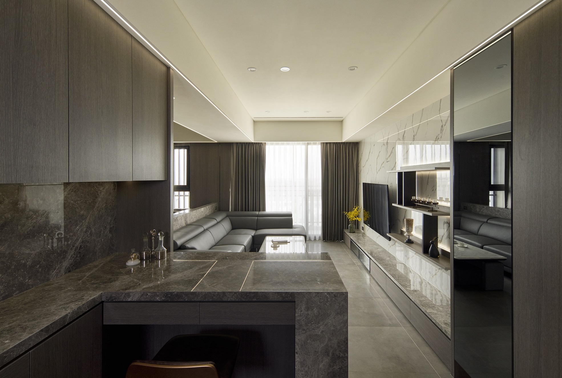 川流不息的紛擾,在我關上門的那一刻得以喘息。 現代生活充滿了表象,而我所嚮往的,是一段能與自己對話的靜謐時光。 當我與知心好友對坐吧檯,空氣中瀰漫著咖啡的香氣,苦甜之間是生活的滋味。閱讀區坐落空間中央,如同精神的核心,承載思索與感知,也容納我在日常中逐漸清晰的自我。 走道巧妙地隱藏浴室與臥房的門片,盡頭以天然石材與烤漆玻璃勾勒出一道曲面端景牆,柔化了動線的結束,也暗藏對空間語言的延伸。 主臥以輕盈為主調,衣櫃選用黑玻與鋁框滑門,主浴門與電視牆共構成一體牆面,視覺乾淨一致。 此案為客變屋, 在一開始就強調無障礙需求, 所以在浴室與外面地板銜接時只有微落差,頭腦尚未清醒去使用浴廁不會用絆倒的風險。 次臥床位略升,床頭與床尾巧設衣櫃,特別是在床位以下的衣櫃內部仍可置物,平衡全室的收納量;L型書桌劃分睡眠與學習,也拓展了使用檯面的自由度。