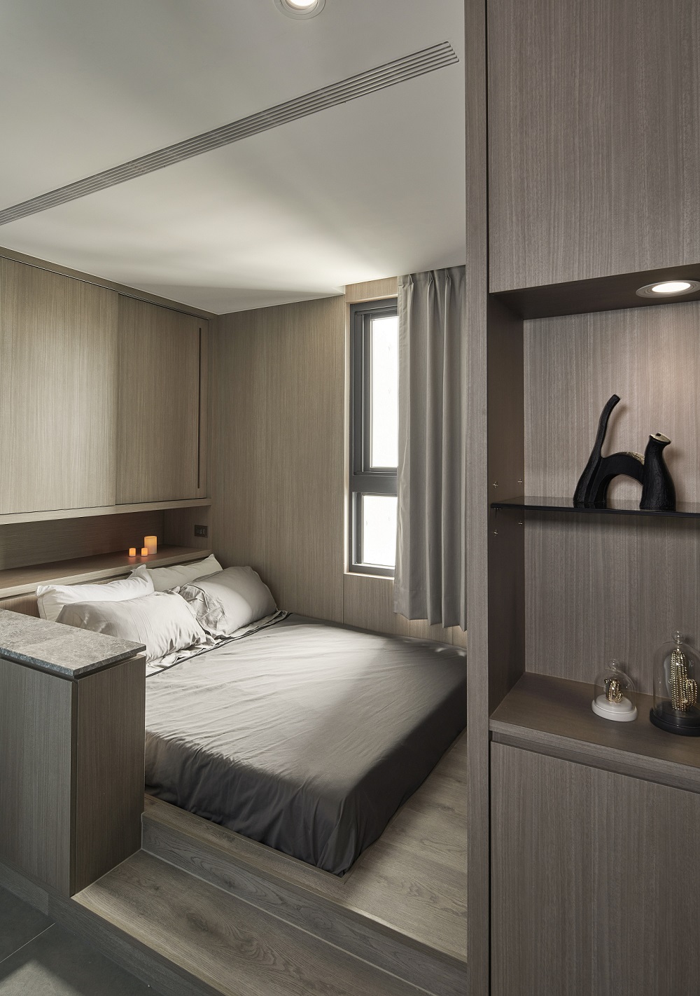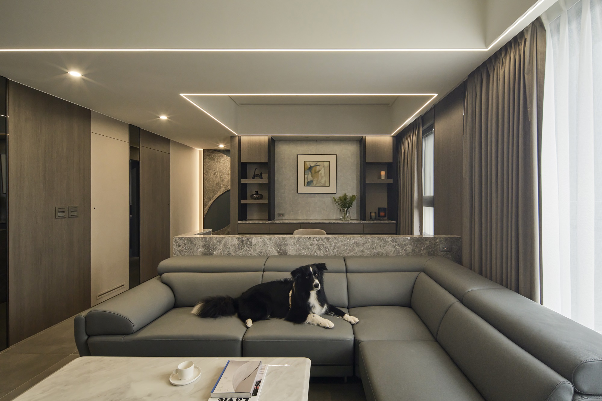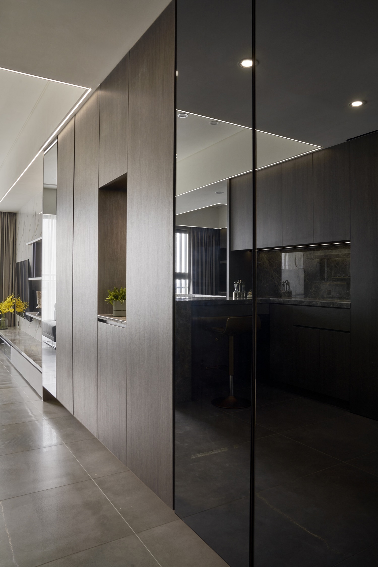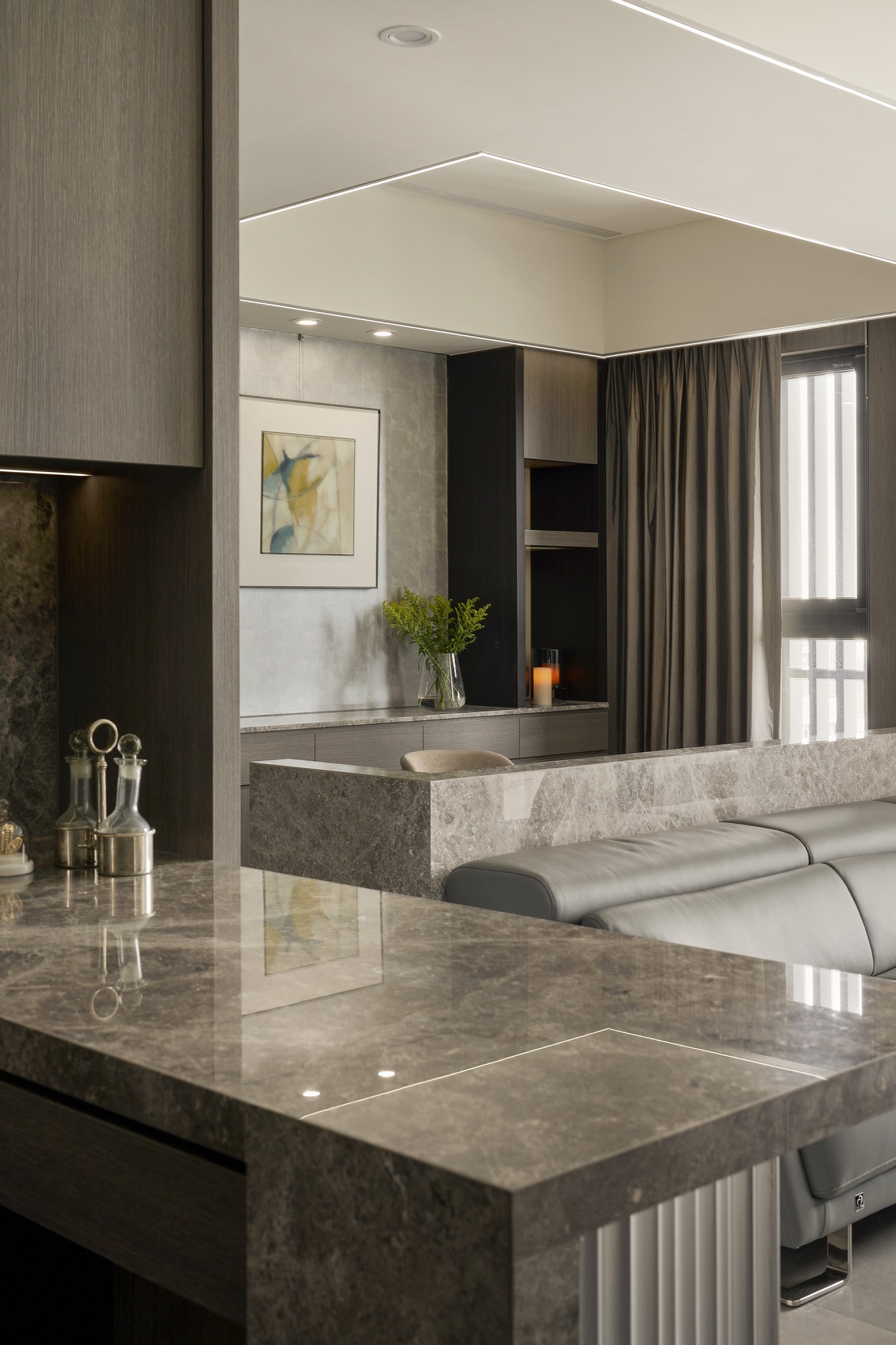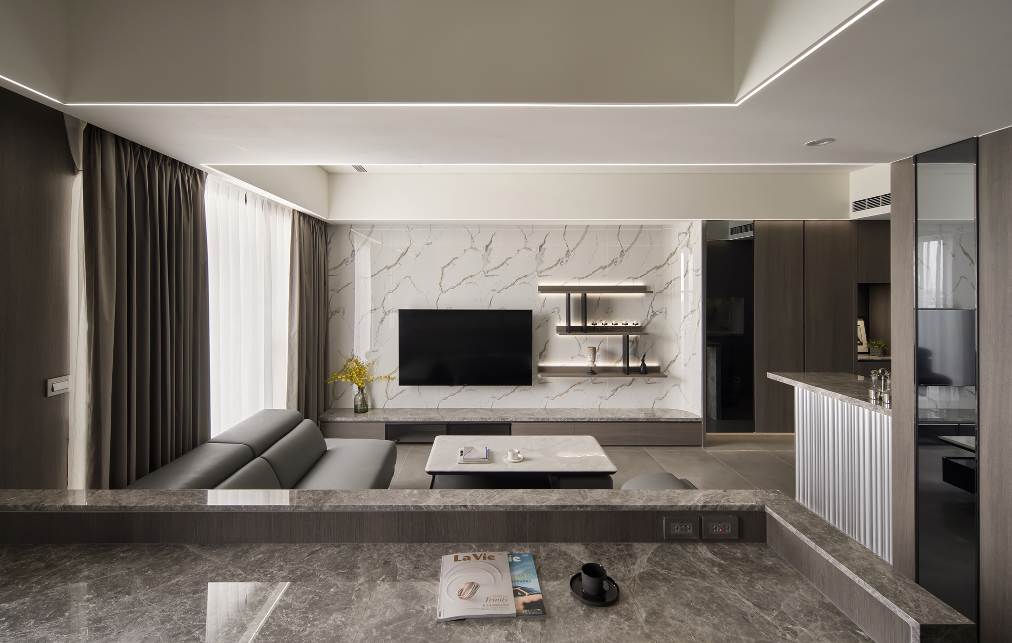 川流不息的紛擾,在我關上門的那一刻得以喘息。 現代生活充滿了表象,而我所嚮往的,是一段能與自己對話的靜謐時光。 當我與知心好友對坐吧檯,空氣中瀰漫著咖啡的香氣,苦甜之間是生活的滋味。閱讀區坐落空間中央,如同精神的核心,承載思索與感知,也容納我在日常中逐漸清晰的自我。 走道巧妙地隱藏浴室與臥房的門片,盡頭以天然石材與烤漆玻璃勾勒出一道曲面端景牆,柔化了動線的結束,也暗藏對空間語言的延伸。 主臥以輕盈為主調,衣櫃選用黑玻與鋁框滑門,主浴門與電視牆共構成一體牆面,視覺乾淨一致。 此案為客變屋, 在一開始就強調無障礙需求, 所以在浴室與外面地板銜接時只有微落差,頭腦尚未清醒去使用浴廁不會用絆倒的風險。 次臥床位略升,床頭與床尾巧設衣櫃,特別是在床位以下的衣櫃內部仍可置物,平衡全室的收納量;L型書桌劃分睡眠與學習,也拓展了使用檯面的自由度。
