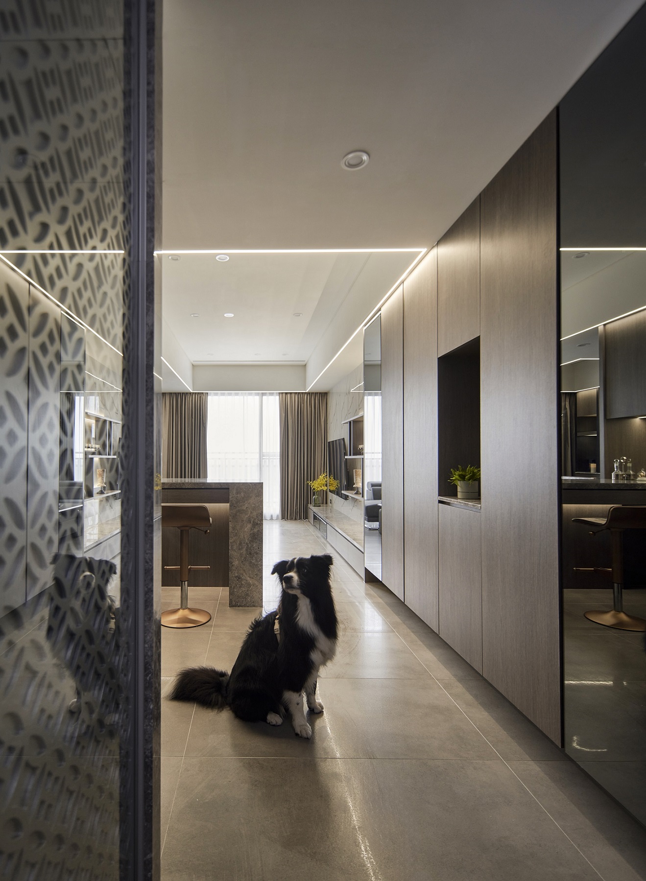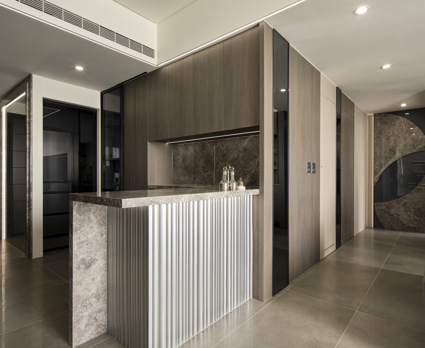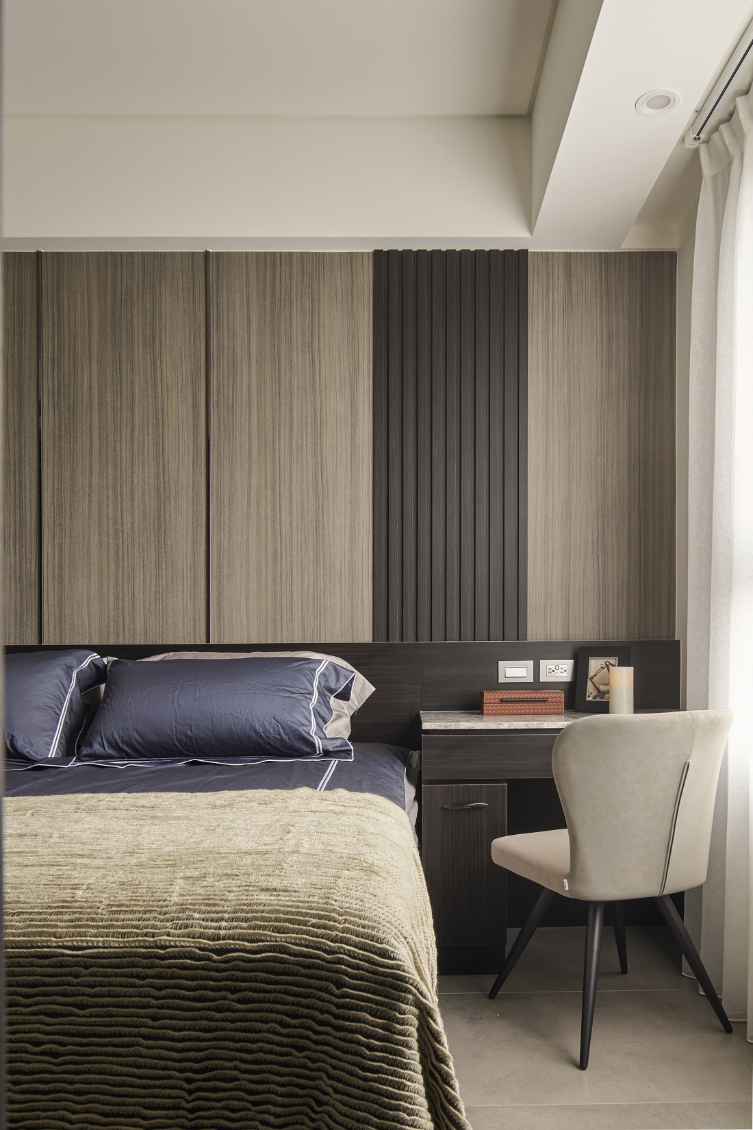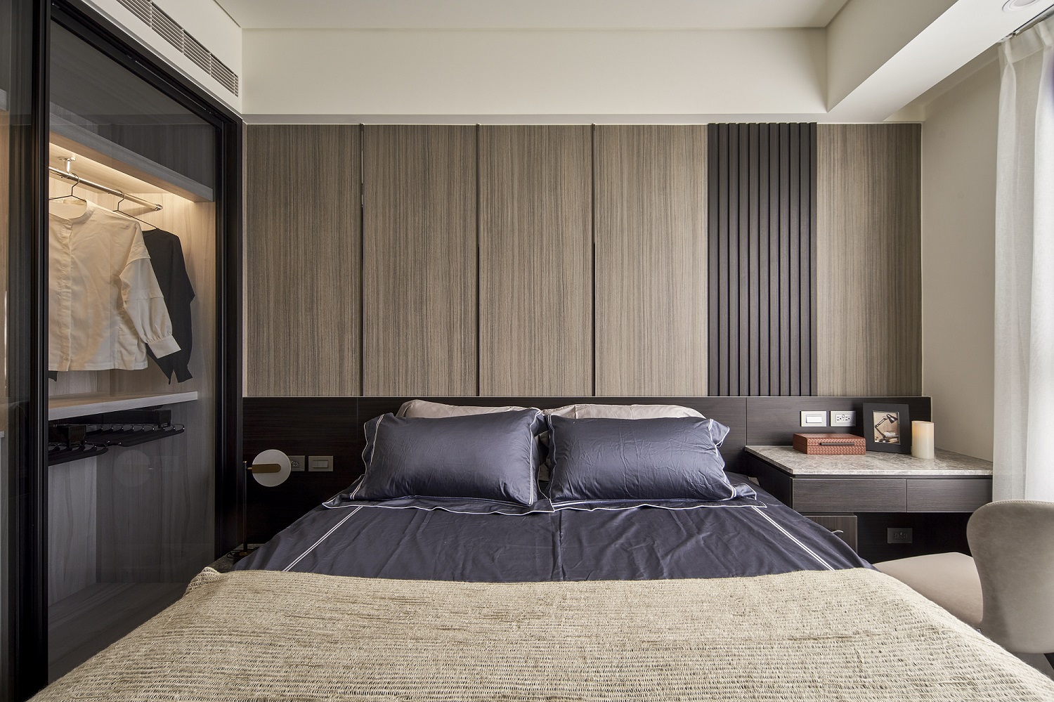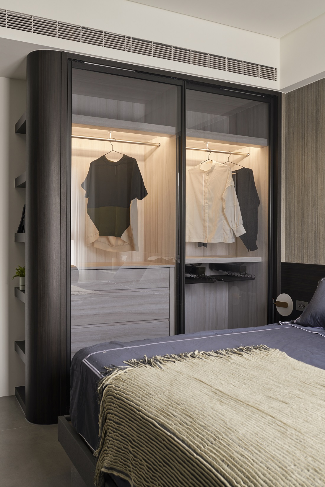 川流不息的紛擾,在我關上門的那一刻得以喘息。 現代生活充滿了表象,而我所嚮往的,是一段能與自己對話的靜謐時光。 當我與知心好友對坐吧檯,空氣中瀰漫著咖啡的香氣,苦甜之間是生活的滋味。閱讀區坐落空間中央,如同精神的核心,承載思索與感知,也容納我在日常中逐漸清晰的自我。 走道巧妙地隱藏浴室與臥房的門片,盡頭以天然石材與烤漆玻璃勾勒出一道曲面端景牆,柔化了動線的結束,也暗藏對空間語言的延伸。 主臥以輕盈為主調,衣櫃選用黑玻與鋁框滑門,主浴門與電視牆共構成一體牆面,視覺乾淨一致。 此案為客變屋, 在一開始就強調無障礙需求, 所以在浴室與外面地板銜接時只有微落差,頭腦尚未清醒去使用浴廁不會用絆倒的風險。 次臥床位略升,床頭與床尾巧設衣櫃,特別是在床位以下的衣櫃內部仍可置物,平衡全室的收納量;L型書桌劃分睡眠與學習,也拓展了使用檯面的自由度。