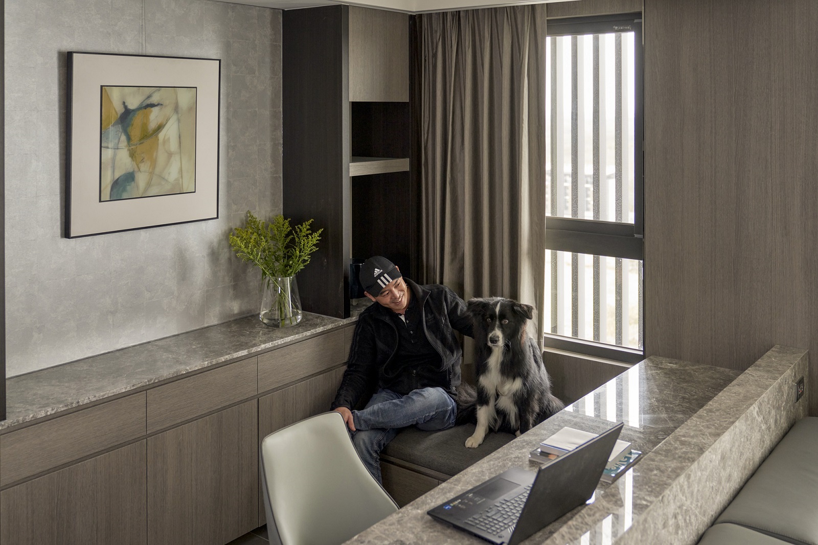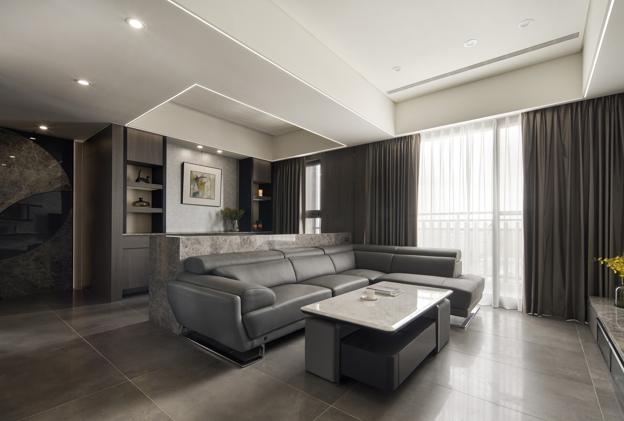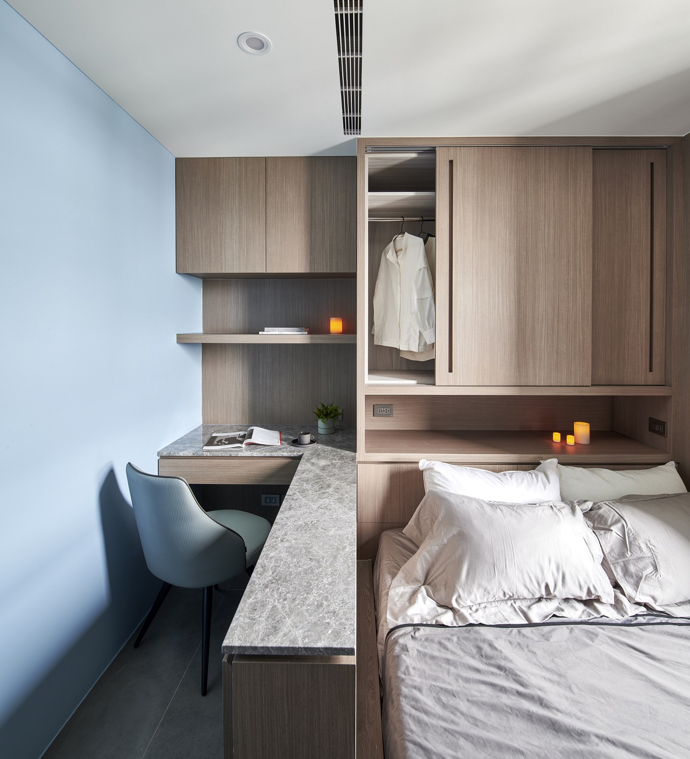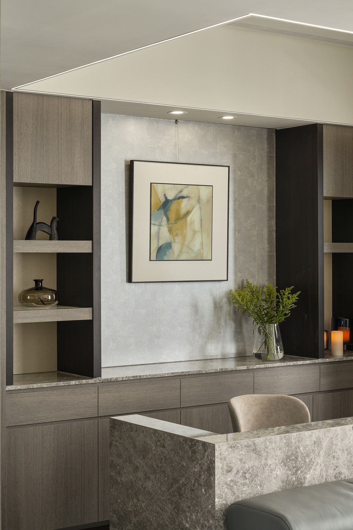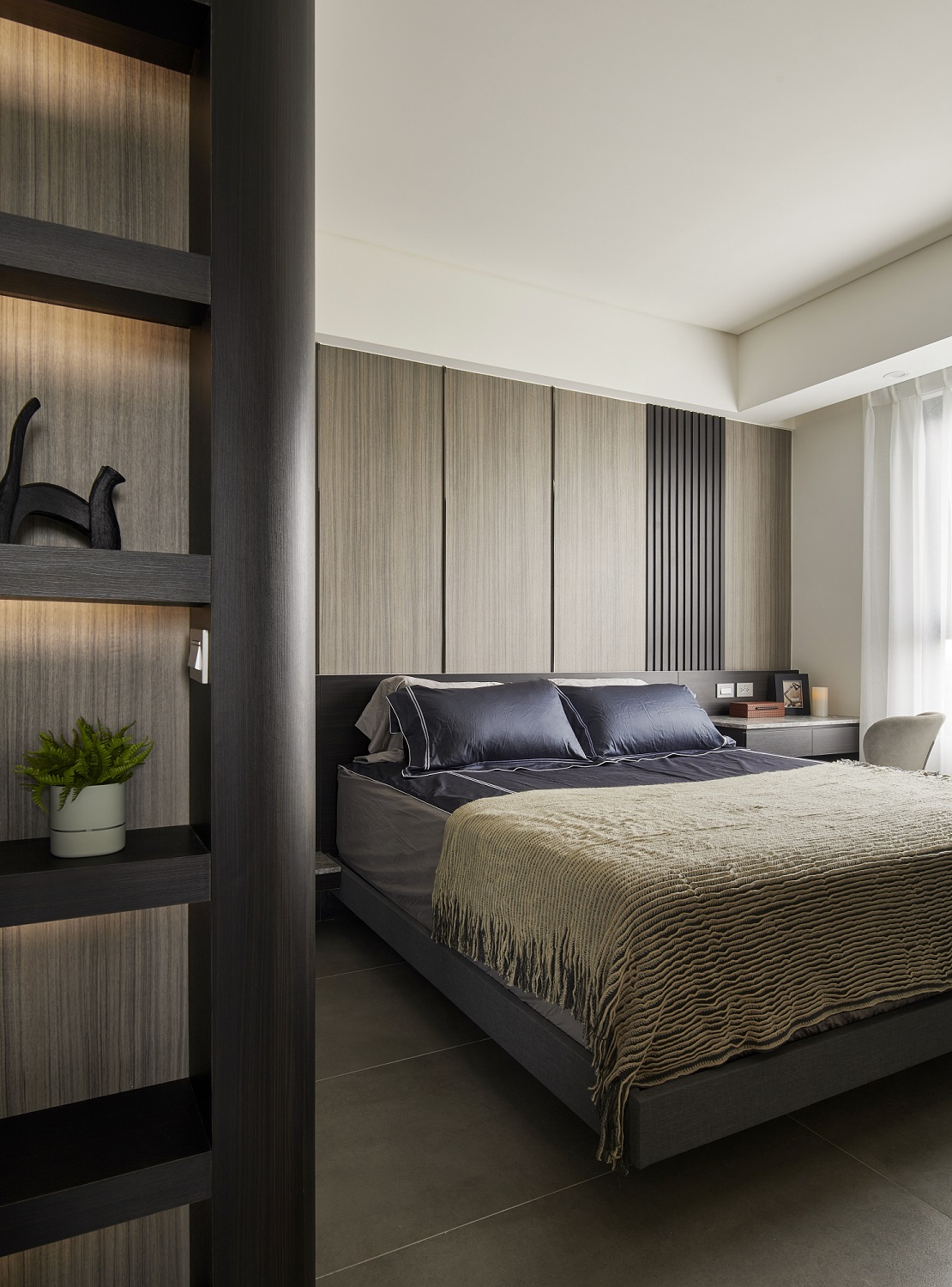 川流不息的紛擾,在我關上門的那一刻得以喘息。 現代生活充滿了表象,而我所嚮往的,是一段能與自己對話的靜謐時光。 當我與知心好友對坐吧檯,空氣中瀰漫著咖啡的香氣,苦甜之間是生活的滋味。閱讀區坐落空間中央,如同精神的核心,承載思索與感知,也容納我在日常中逐漸清晰的自我。 走道巧妙地隱藏浴室與臥房的門片,盡頭以天然石材與烤漆玻璃勾勒出一道曲面端景牆,柔化了動線的結束,也暗藏對空間語言的延伸。 主臥以輕盈為主調,衣櫃選用黑玻與鋁框滑門,主浴門與電視牆共構成一體牆面,視覺乾淨一致。 此案為客變屋, 在一開始就強調無障礙需求, 所以在浴室與外面地板銜接時只有微落差,頭腦尚未清醒去使用浴廁不會用絆倒的風險。 次臥床位略升,床頭與床尾巧設衣櫃,特別是在床位以下的衣櫃內部仍可置物,平衡全室的收納量;L型書桌劃分睡眠與學習,也拓展了使用檯面的自由度。
