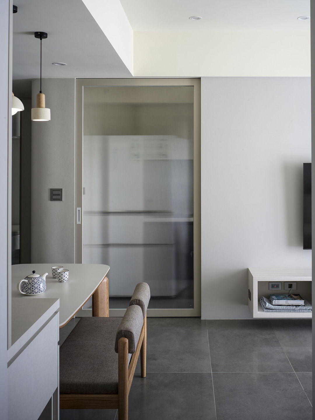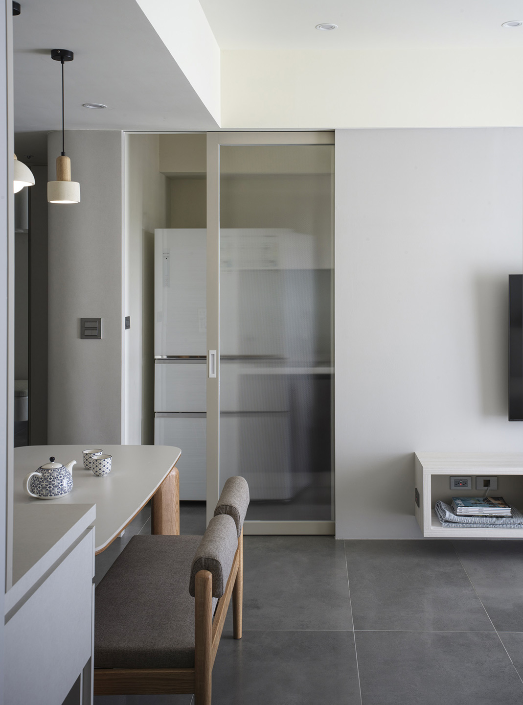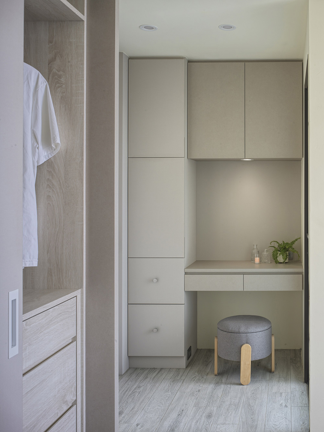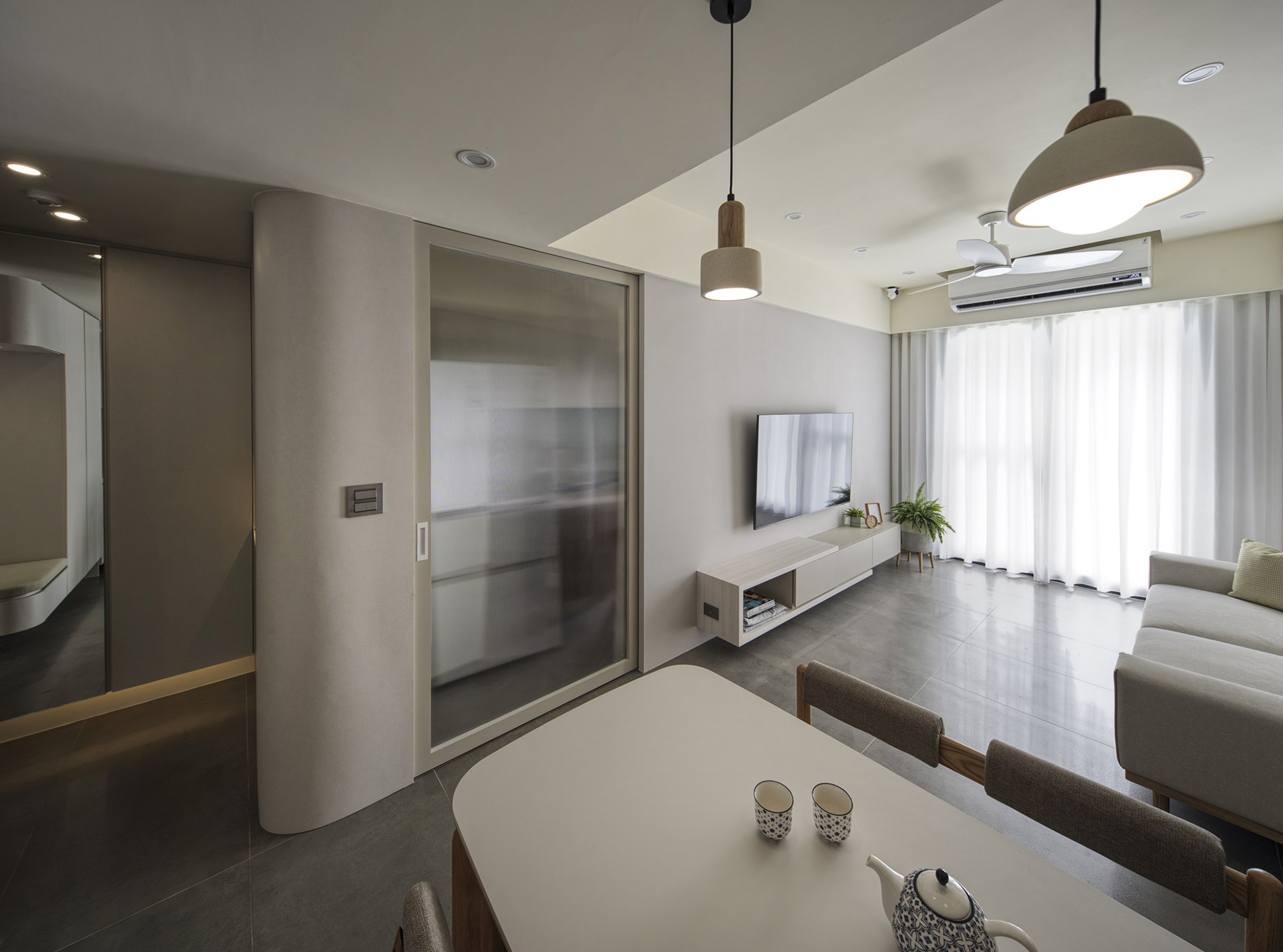 A New Life 這是一對年輕的夫妻,養了一隻可愛小貓的家。 拍攝當天因為膽小害羞貓咪還不能適應新環境, 所以就無法入鏡。 主人喜歡空間帶有暖意的淡淡大地色系及中性灰色的穩定感, 在討論的期間中, 喜歡木紋的先生及喜歡素色微有紋理的太太意見相互碰撞, 在多次取捨後,才終於定案。 電視櫃和落地窗中間預留未來要放置的貓跳台, 面對沙發的左側則預留朋友要送給他們的自動貓砂機, 餐桌旁的餐櫃下凹洞是放置貓咪吃飯及喝水的地方, 貓咪用餐區上面是一個大抽屜, 作為貓咪的保健品、零食櫃…等, 當然電源也是要預留好。 入住後, 主人說他很愛待在餐櫃上的層板, 在一開始的結構設計就有先考量到載重的問題囉! 進入主臥後, 原本開門的配置, 為了讓浴室外門口的化妝檯在使用上不受開門影響, 調整為拉門的設計。 拉門上面設計了貓門, 可惜目前膽小的貓咪仍未克服心理障礙。 空間以弧形設計延展,柔化了僵硬線條, 純淨而舒適~