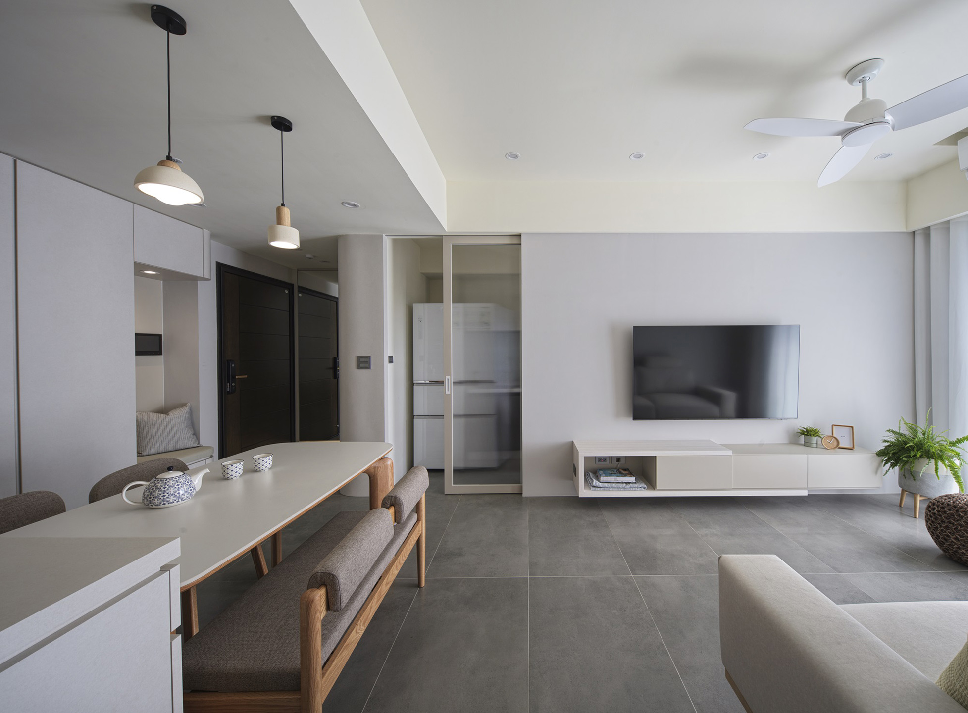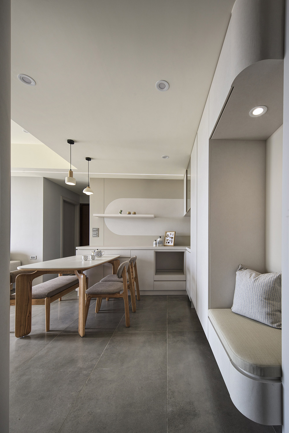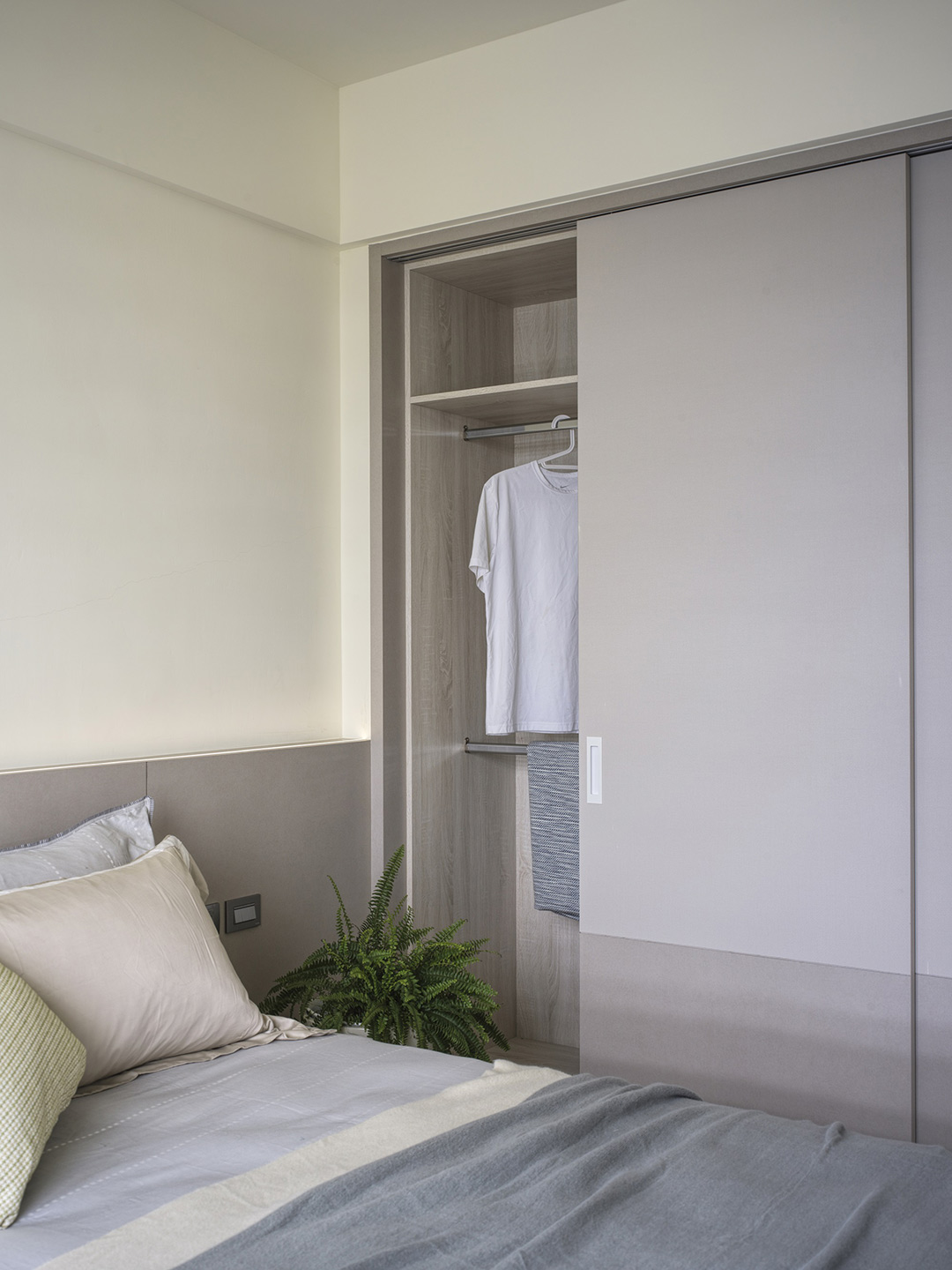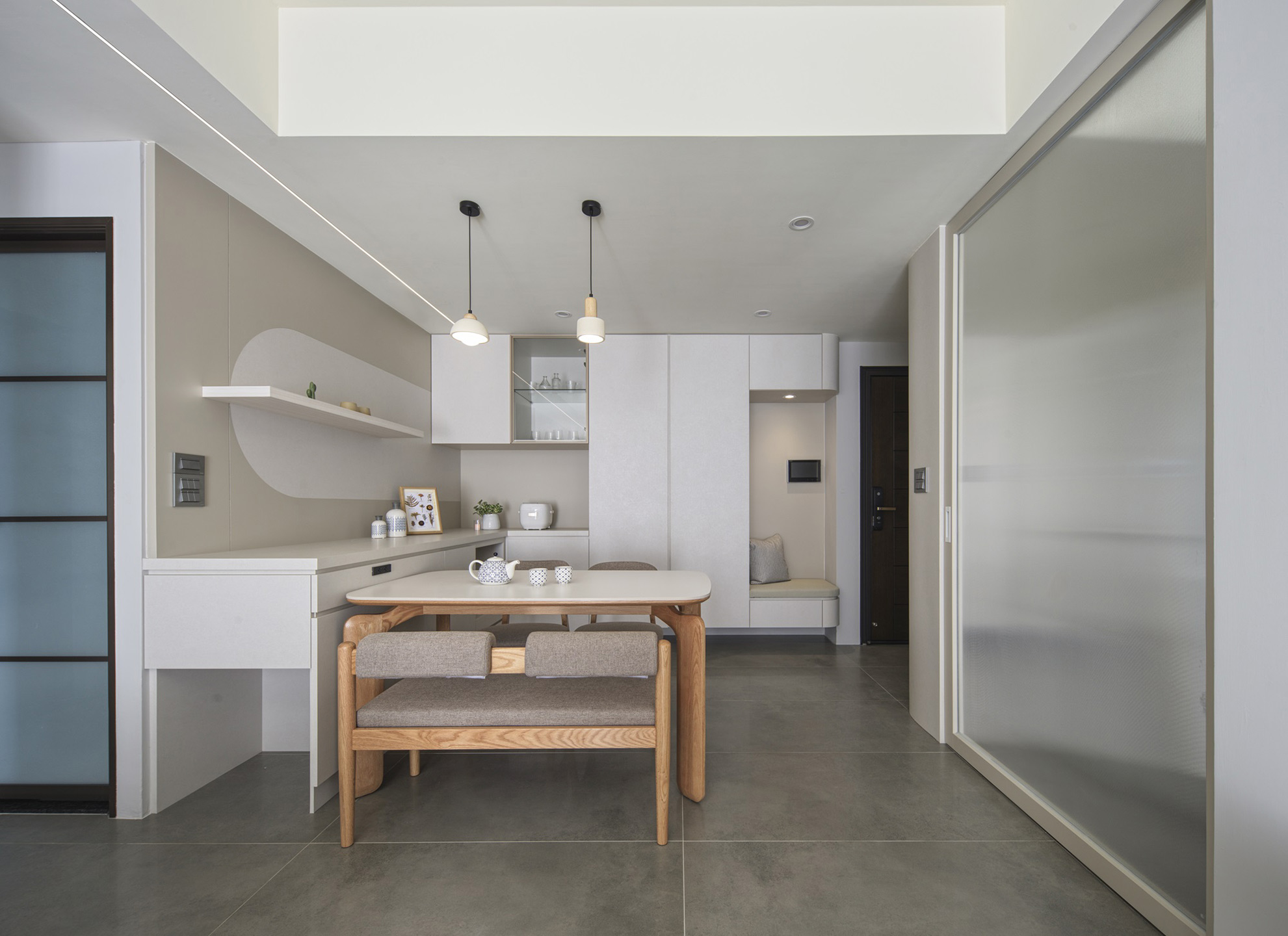 A New Life 這是一對年輕的夫妻,養了一隻可愛小貓的家。 拍攝當天因為膽小害羞貓咪還不能適應新環境, 所以就無法入鏡。 主人喜歡空間帶有暖意的淡淡大地色系及中性灰色的穩定感, 在討論的期間中, 喜歡木紋的先生及喜歡素色微有紋理的太太意見相互碰撞, 在多次取捨後,才終於定案。 電視櫃和落地窗中間預留未來要放置的貓跳台, 面對沙發的左側則預留朋友要送給他們的自動貓砂機, 餐桌旁的餐櫃下凹洞是放置貓咪吃飯及喝水的地方, 貓咪用餐區上面是一個大抽屜, 作為貓咪的保健品、零食櫃…等, 當然電源也是要預留好。 入住後, 主人說他很愛待在餐櫃上的層板, 在一開始的結構設計就有先考量到載重的問題囉! 進入主臥後, 原本開門的配置, 為了讓浴室外門口的化妝檯在使用上不受開門影響, 調整為拉門的設計。 拉門上面設計了貓門, 可惜目前膽小的貓咪仍未克服心理障礙。 空間以弧形設計延展,柔化了僵硬線條, 純淨而舒適~